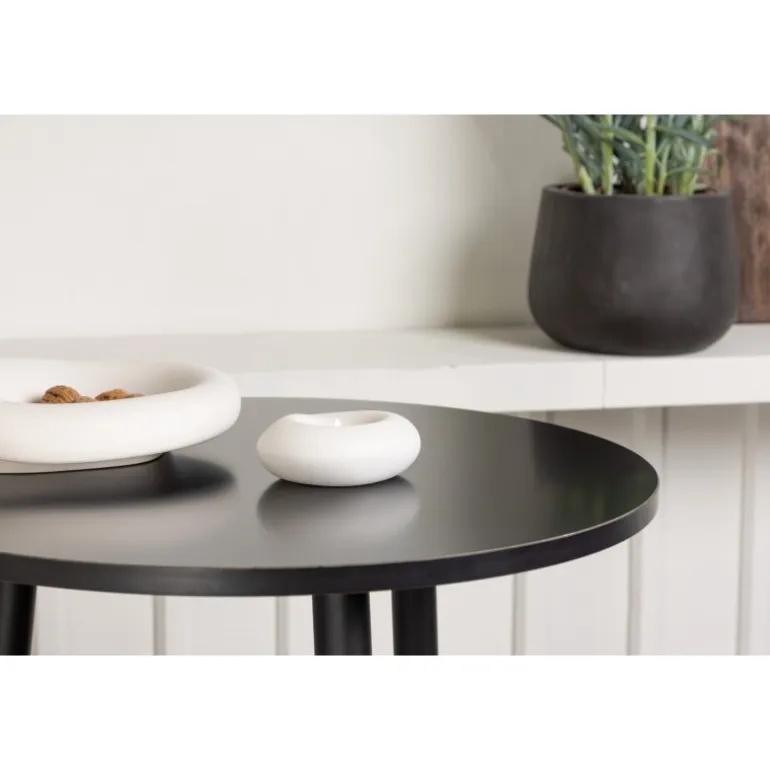 - Stilfuldt barbord: Rund bordplade i sort MDF og sorte metalben.