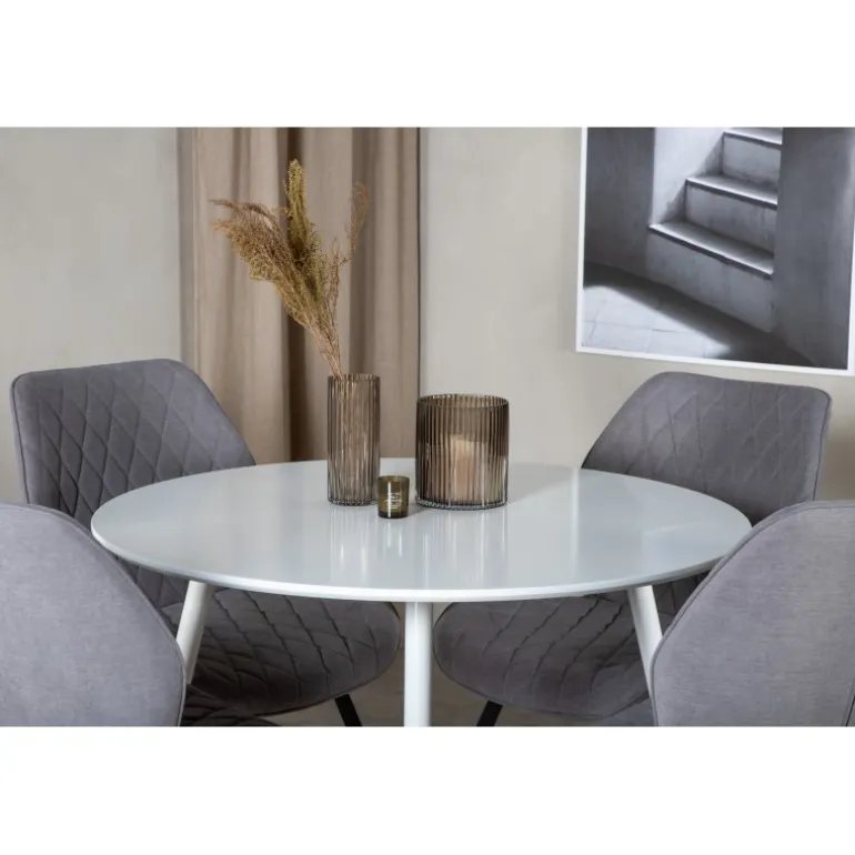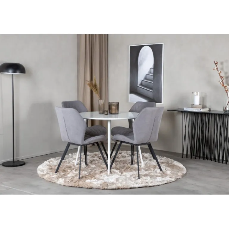 Kombinationen af forskellige farver og materialer gør altid et stort indtryk. Med vores Plaza spisebord og Gemma spisebordsstole får du en kombination, der er både moderne, hyggelig og tidløs! Dette sæt passer perfekt til ethvert moderne hjem, og vil skabe en indbydende atmosfære til dine måltider. Plaza Rundt Spisebordssæt er designet med fokus på stil og funktionalitet, hvilket sikrer, at du får et produkt af høj kvalitet, som både ser godt ud og er praktisk i brug.