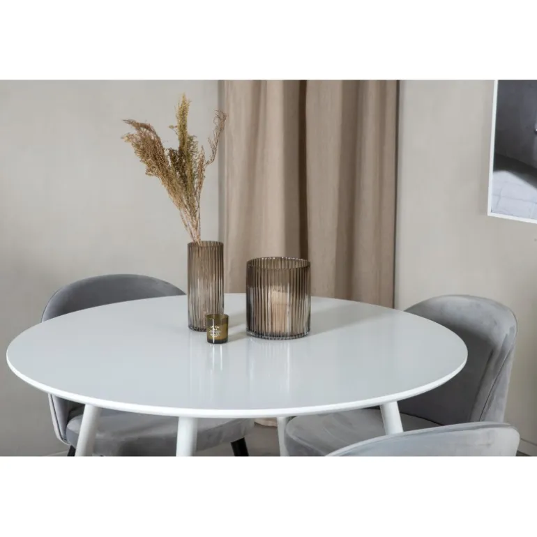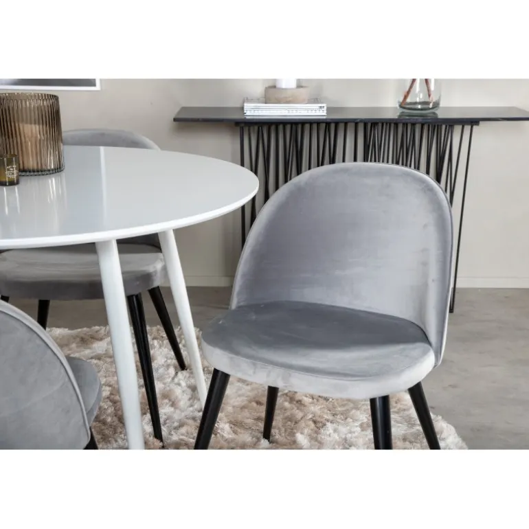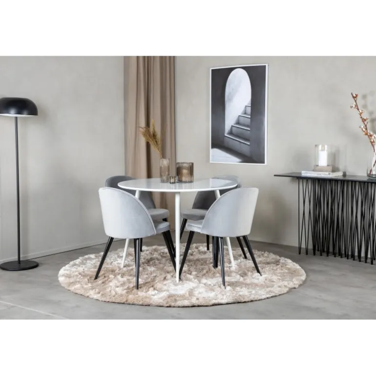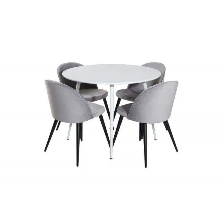 Klassisk Spisebordssæt som passer i de fleste husholdninger! Spisebordet Plaza sammen med stolene i Velvet-serien er lavet til dem, der ønsker at skabe en hyggelig og moderne stemning i hjemmet. Med en elegant hvid bordplade og komfortable stole i sort eller grå, er dette sæt både stilfuldt og funktionelt. Perfekt til middage med familie og venner.