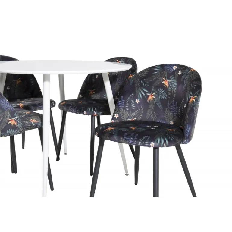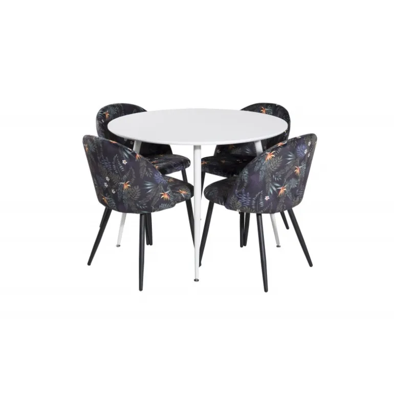 Plaza moderne og stilfuldt Spisebordssæt – her sammen med spisestole i serien Velvet. Skab noget pænt og socialt med plads til god mad og hyggeligt samvær! Dette sæt kombinerer et hvidt bord af MDF og stål med sorte stole, der giver et elegant og moderne udtryk til dit hjem. Perfekt til både hverdag og festlige lejligheder.