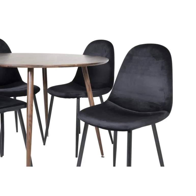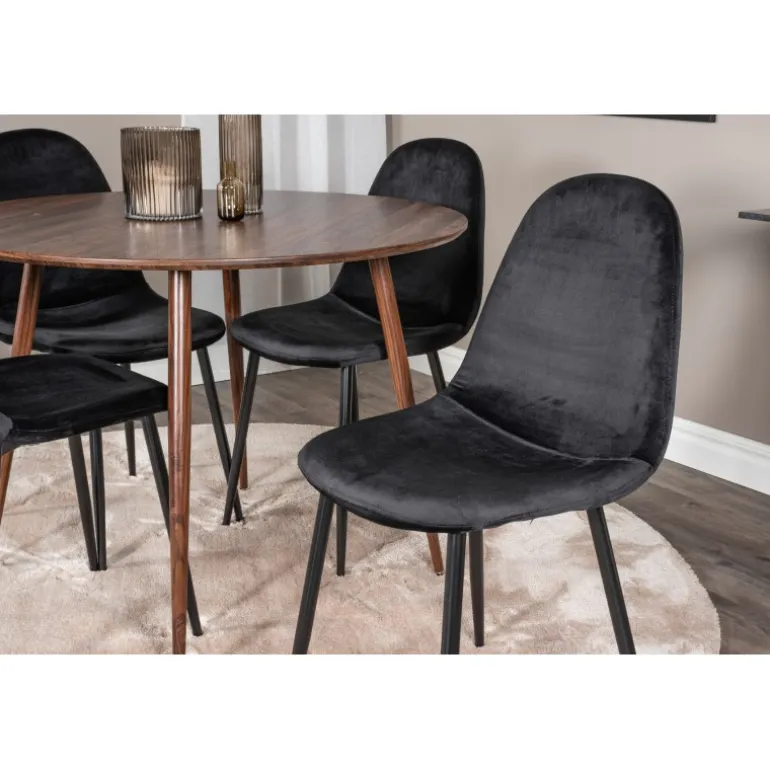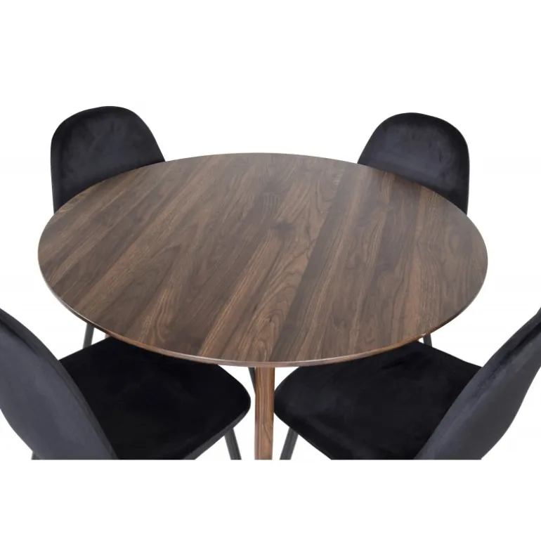 - Elegant Design: Kombinerer et rundt bord i valnød og sorte stole for et klassisk look.