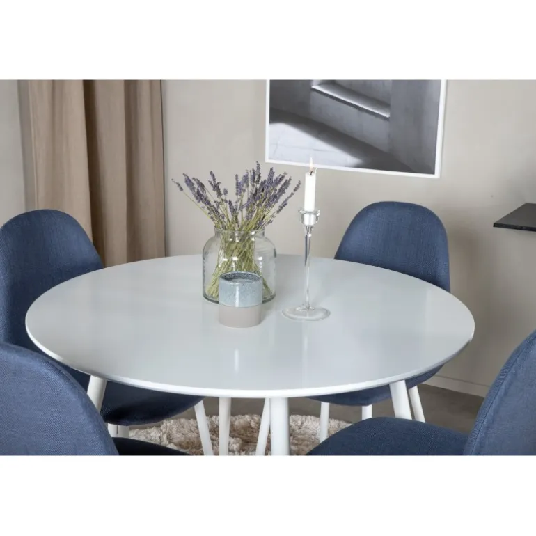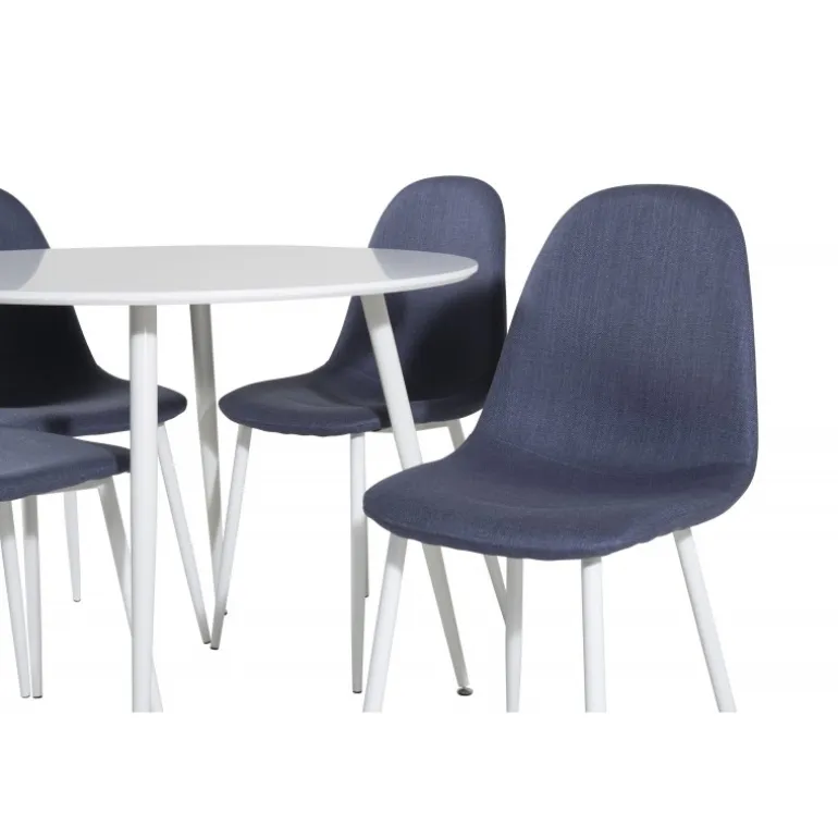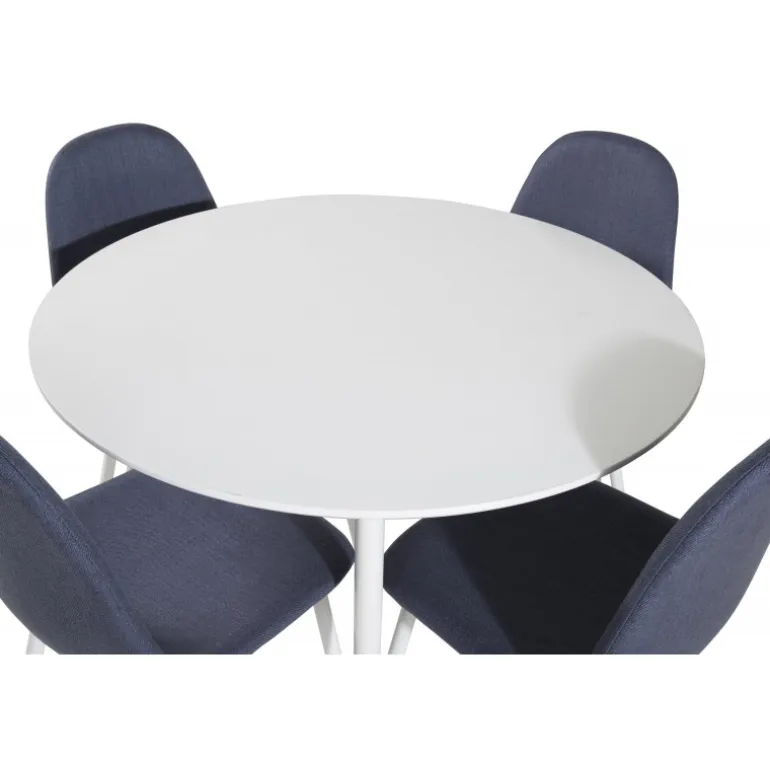 Klassisk Spisebordssæt, der passer ind i de fleste husholdninger! Spisebordet Plaza sammen med stole i Polar-serien er perfekt til dem, der ønsker at skabe en hyggelig og moderne stemning i hjemmet. Plaza Rundt Spisebordssæt kombinerer stil og funktionalitet med sit hvide MDF-bord og komfortable blå stole. Dette sæt er ideelt til familiemiddage og sociale sammenkomster.