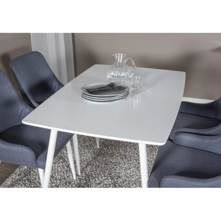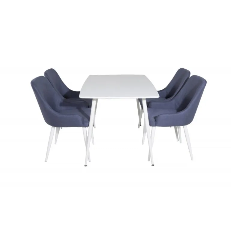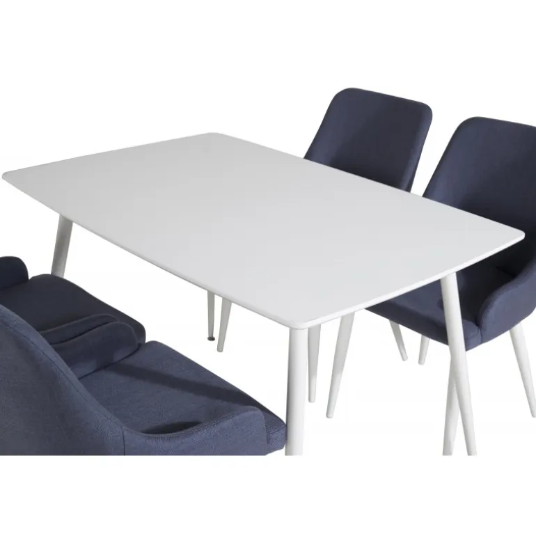 Enkelt madgruppe, der passer i de fleste husholdninger! Spisebord Polar sammen med sine venlige stole i Comfort-serien – her vil du være glad for at blive i godt selskab i lang tid! Dette moderne Spisebordssæt kombinerer stil og komfort, hvilket gør det til et perfekt valg for enhver spisestue. Polar Rundt Spisebordssæt tilbyder en elegant hvid bordplade og komfortable stole i blå og hvid, fremstillet af holdbare materialer som bøjet træ, skum, MDF og stål. Det er nemt at samle og passer perfekt til din daglige brug.