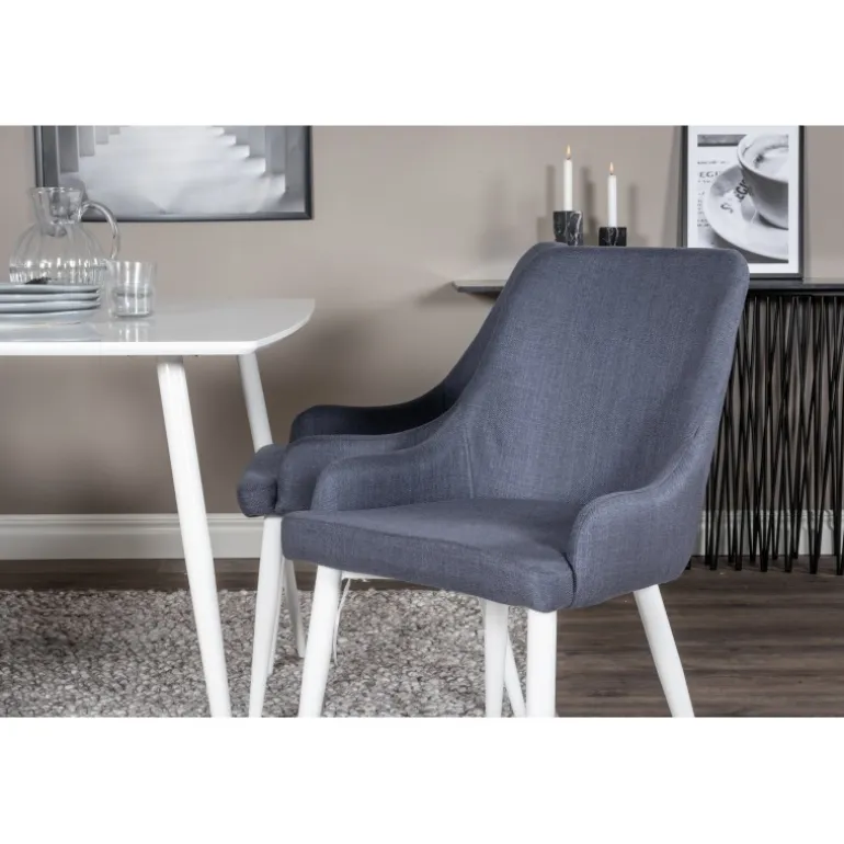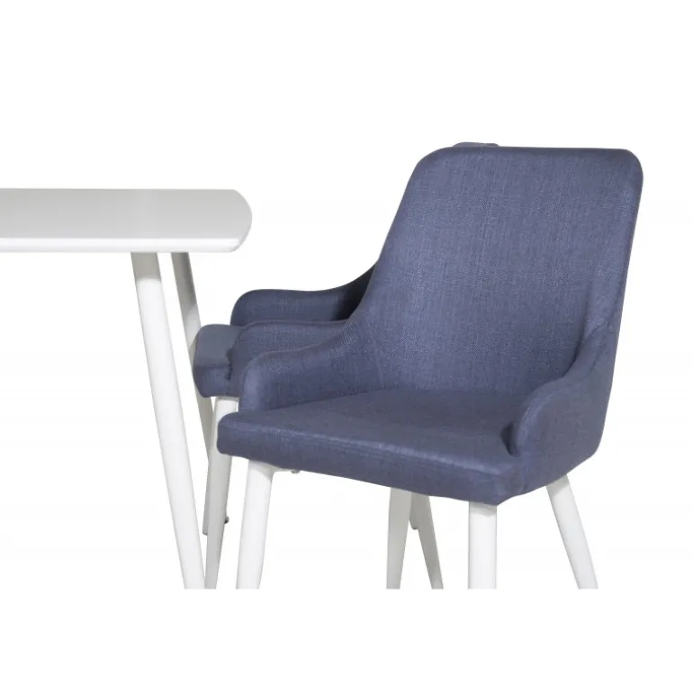 - Elegant design: Hvid bordplade med blå og hvide stole, passer til enhver indretning.