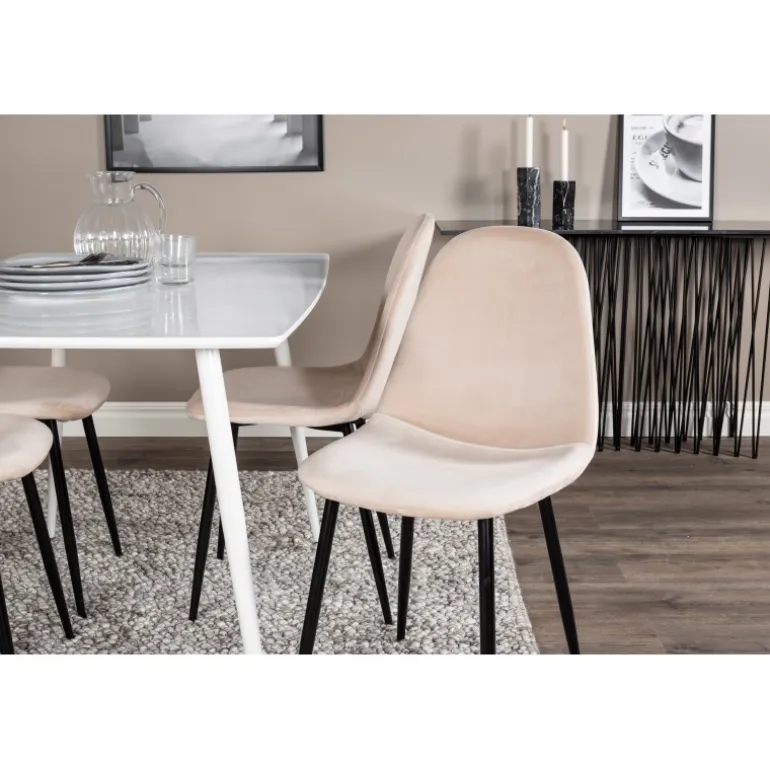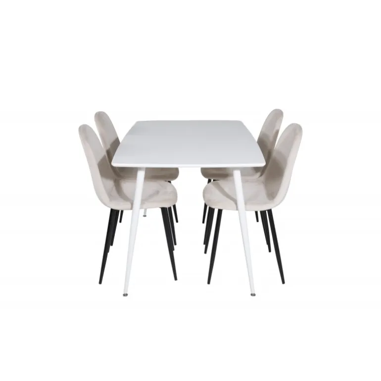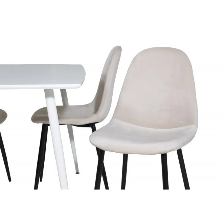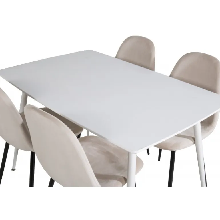 Vores enkle og klassiske spisebord Polar sammen med vores populære luksuriøse stole i samme serie. Skab noget dejligt at glæde sig til derhjemme! Dette Spisebordssæt kombinerer elegance og funktionalitet, hvilket gør det perfekt til enhver spisestue. Med en hvid MDF-bordplade og stole i bøjet træ, skum og stål, tilbyder dette sæt både stil og holdbarhed. Tilgængeligt i farverne beige, sort og hvid, så du kan finde den perfekte match til dit hjem.