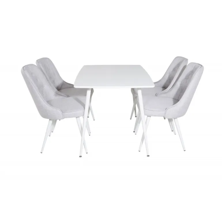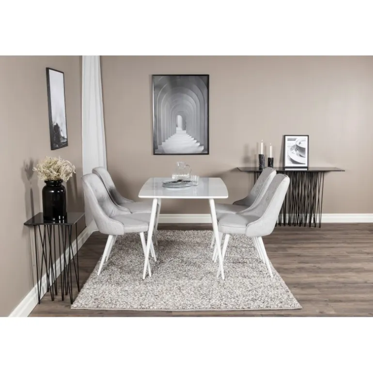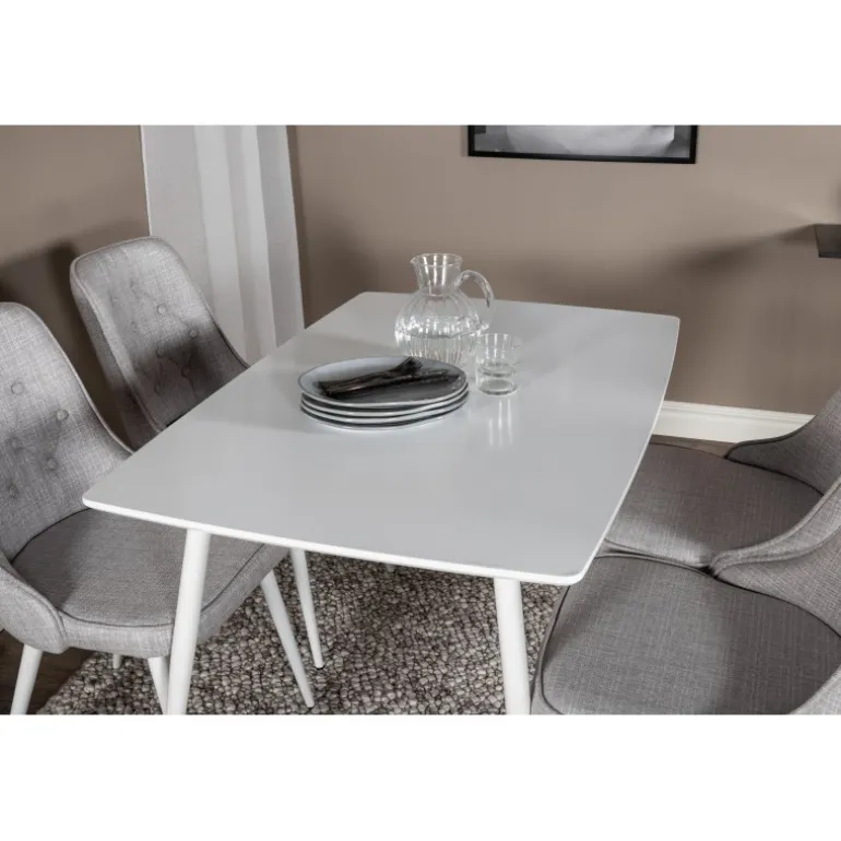 Vores enkle og klassiske spisebord Polar kombineret med vores luksuriøse spisebordsstole Velvet. Her får du en stilfuld kombination, der står tidens prøve. Inviter til middag og socialt samvær med dette elegante sæt. Bordet og stolene er fremstillet af holdbare materialer som MDF, krydsfiner og stål, hvilket sikrer langvarig brug. Fås i hvid og grå, hvilket passer perfekt til ethvert interiør.