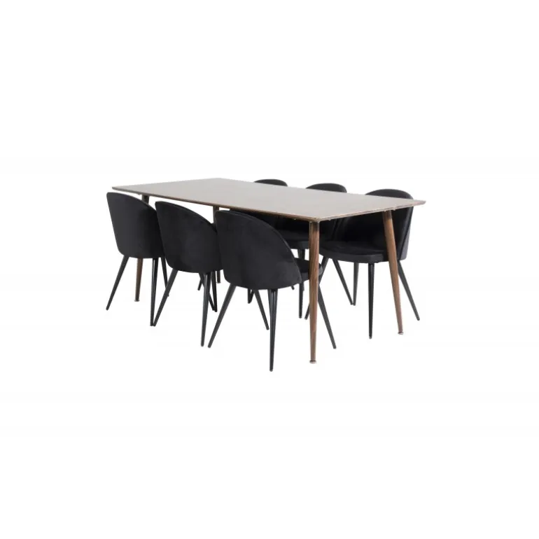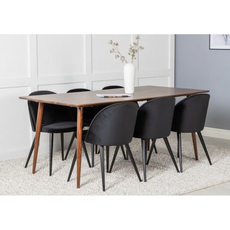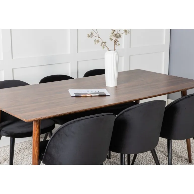 Vores spisebord Polar i rustikt design sammen med vores siddevenlige spisebordsstole Velvet giver dig en luksuriøs og stilfuld kombination, der holder over tid. Inviter til middag og socialt samvær med dette tidløse møbelsæt. Polar Rektangulær Spisebordssæt er skabt til at imponere med sin robuste MDF-bordplade og elegante stålben. De sorte Velvet stole tilføjer et moderne touch til dit spisestueområde.