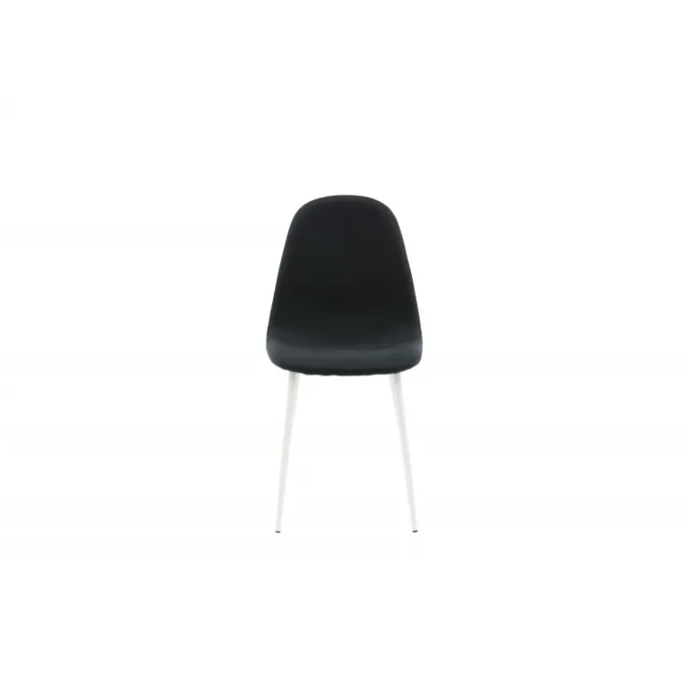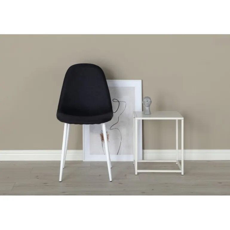 Lad tiden ved spisebordet blive dagens højdepunkt! Spisebordsstolen fra Polar-serien har et rundet design med et klassisk look – lige så praktisk som tidløst! Ryglæn og sæde er polstret med sort polyesterstof, og benene er i hvid pulverlakeret metal. Nogle samling er påkrævet. Det slanke design gør stolen nem at matche med andre møbler! Plejevejledning: Brug stofspray til at imprægnere stoffet, før du begynder at bruge det; dette vil også gøre eventuel snavs og pletter lettere at fjerne i fremtiden. Fjern pletter straks; gnid ikke, men prøv forsigtigt at opsuge dem med en klud.