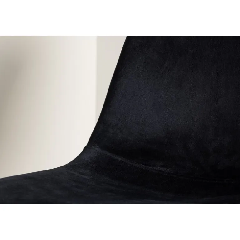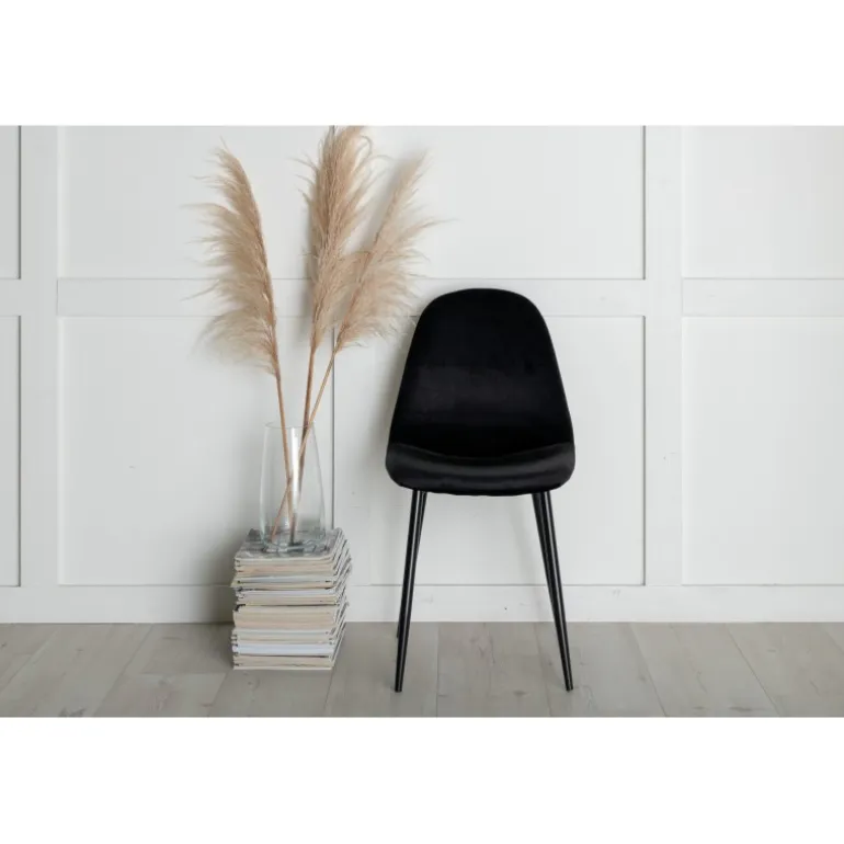 Sofistikeret spisestol i gennemført sort farve med moderne design – hvad mere kan man ønske sig? Polar har et fuldt polstret design, ben i sort pulverlakeret metal og en afrundet ryg og sæde i sort fløjlsstof med blød polstring. Undgå kompromiser mellem komfort og design! Nogle samlinger kræves. Plejeinstruktioner: Fløjl har tendens til at få aftryk, når bunken ligger ned. Aftrykkene kan få stoffet til at se slidt ud, hvilket er normalt for denne type materiale. Afhængigt af, hvordan lyset falder, kan stoffet skifte i flere forskellige nuancer.