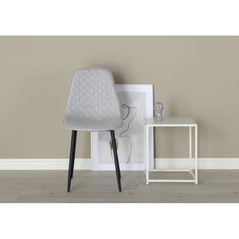 Stilfuld spisestuestol i enkelt design og elegante detaljer! Spisestuestolen fra Polar-serien har et gennemtænkt design med en let afrundet ryg og sæde i polstret gråt polyesterstof med dekorative syninger på indersiden, der danner et dekorativt gittermønster. Benene er i sort pulverlakeret metal. Let montering er påkrævet. Sid behageligt og skab et moderne blikfang i stuen. Plejeråd: Brug tekstilspray til at imprægnere stoffet, før du begynder at bruge det, det vil også gøre eventuelle pletter lettere at fjerne i fremtiden. Fjern pletter med det samme, gnid ikke, men forsøg at suge op forsigtigt med en klud.