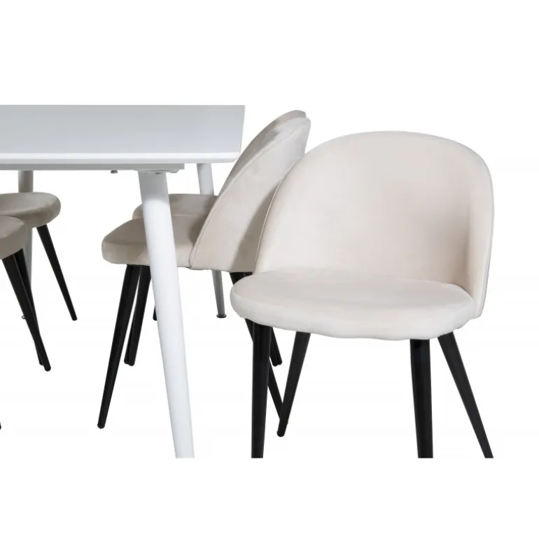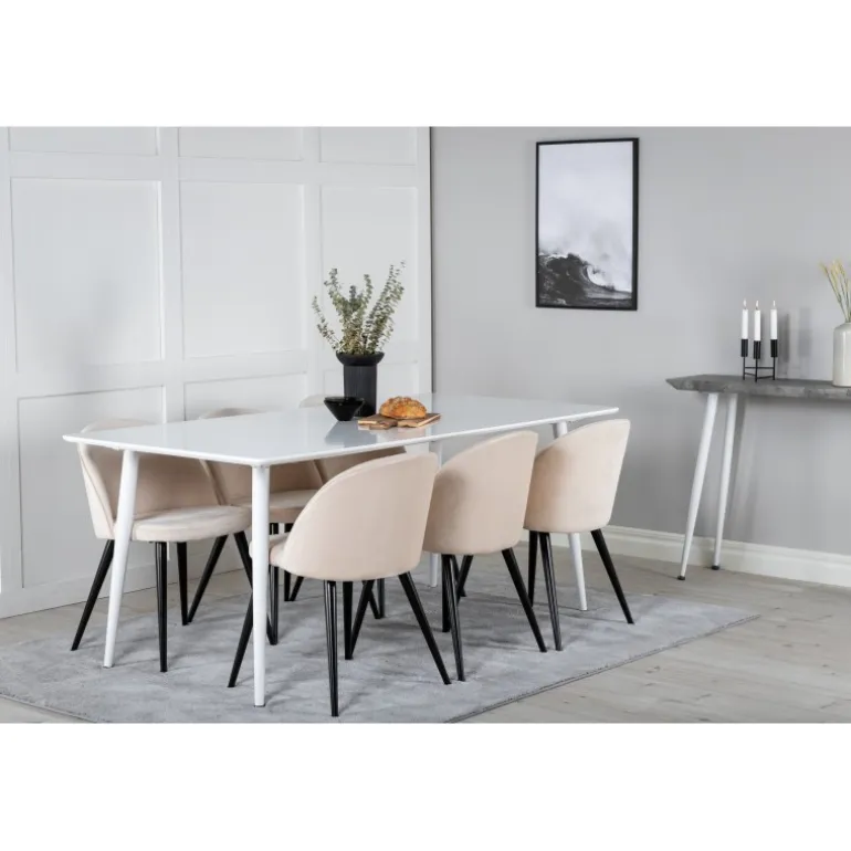 Vores enkle og klassiske spisebord Polar sammen med vores komfortable spisebordsstole Velvet. Her får du en luksuriøs og stilfuld kombination, der holder over tid. Inviter til middag og socialt samvær!