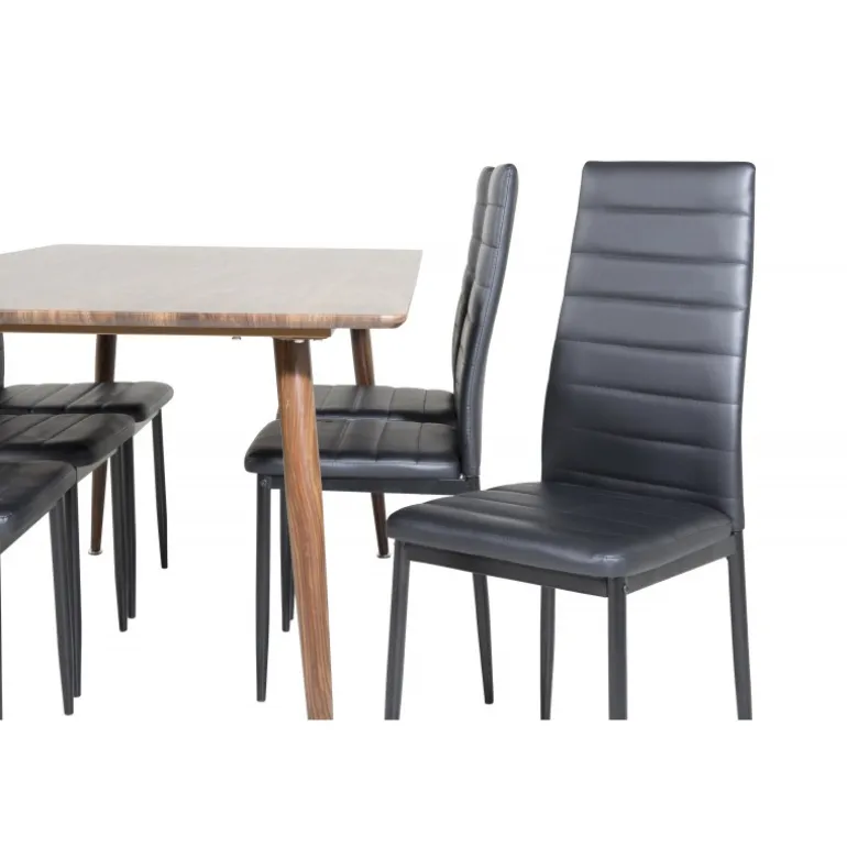 Polar, moderne og pænt spisebord – her sammen med høje læderlignende spisestole i Slim serien. Skab noget pænt og socialt med plads til god mad og hyggeligt samvær! Dette sæt kombinerer stil og funktionalitet med sit naturfarvede MDF-bord og sorte, læderlignende stole, hvilket gør det perfekt til enhver spisestue. Montering krævet.