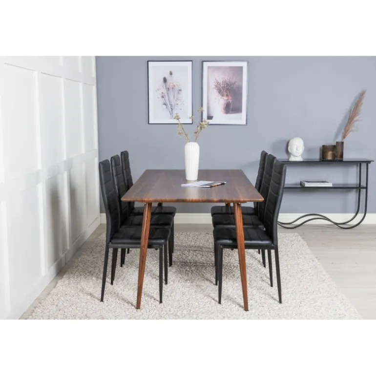 - Farvekombination: Naturfarvet bord med sorte læderlignende stole for et elegant look.