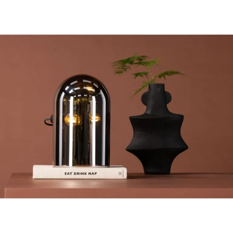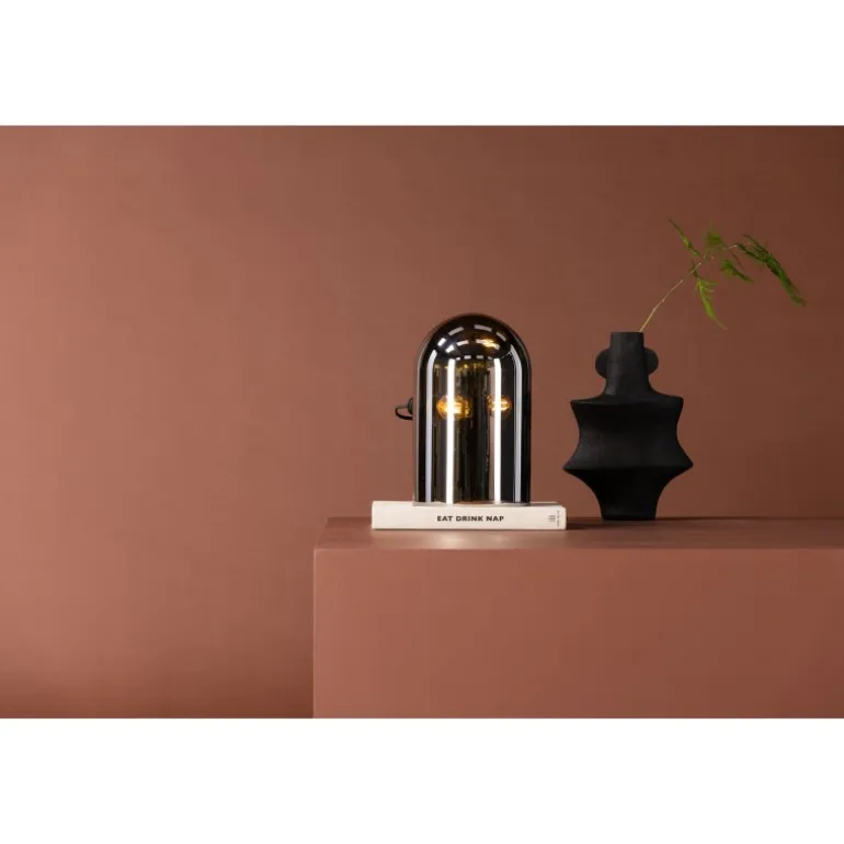 Quentin bordlampen er den perfekte tilføjelse til det moderne hjems interiør. Lampen er designet med runde former og røgfarvet glas med spejleffekt. Denne trendy lampe er nem at matche med andre interiørelementer, og den kompakte størrelse gør det muligt at placere den selv på smalle steder, som f.eks. en hylde. Med denne lampe skaber du et unikt blikfang og får samtidig en hyggelig glød.