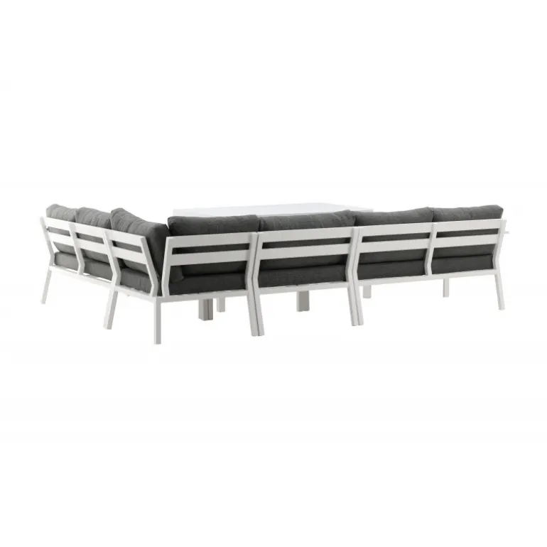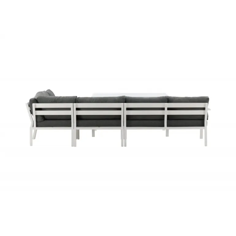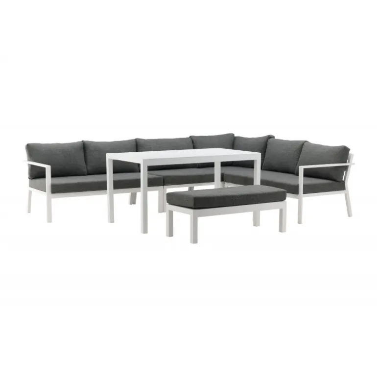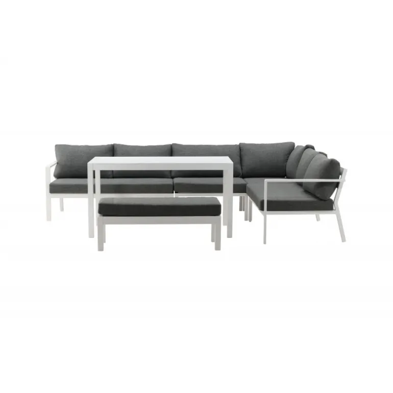 Ramos hjørnegruppe er perfekt for dig, der ofte har mange gæster og har en større terrasse eller patio! Med sit tidløse design og holdbare materialer, er det et møbel, der kan nydes i mange år. Perfekt til en kop kaffe eller læsning i solen. Stellet er i hvidlakeret aluminium og med grå puder. Vedligeholdelsesråd: Udendørsmøbler i aluminium og rustfrit stål bør rengøres regelmæssigt med vand og mild sæbe. Skyl altid grundigt med rigeligt vand, især hvis møblerne står nær havet, hvor salt kan transporteres gennem luften. Salt kan føre til korrosion, der kan forårsage afskalning eller bobler i lakken. Brug ikke højtryksrenser, da den høje tryk kan beskadige overfladen. For maksimal levetid anbefales det at opbevare møblerne i et tørt rum eller under et møbelbetræk. Aluminium er et letvægtsmateriale, der gør dine møbler fleksible at flytte.