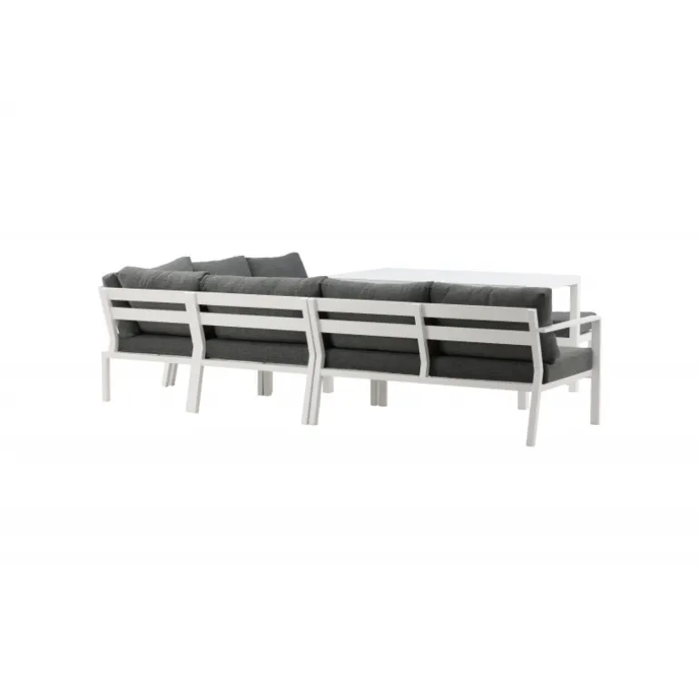 - Holdbare materialer: Hvidlakeret aluminium og grå puder.