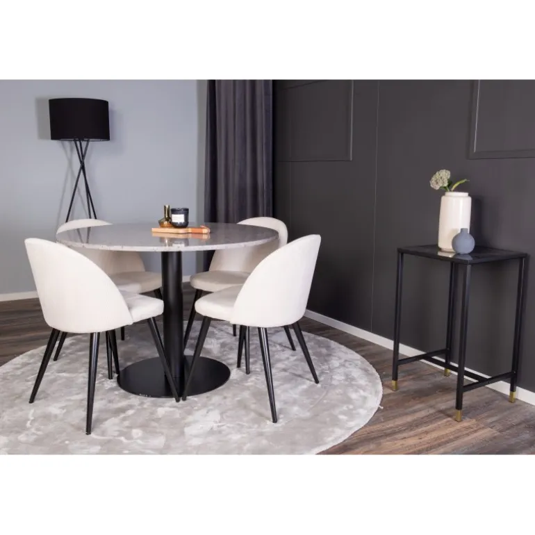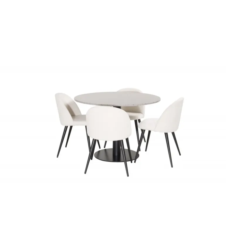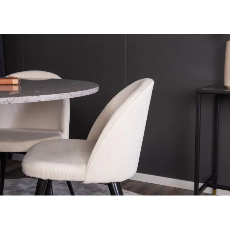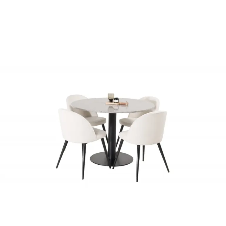 Oplev den perfekte kombination af moderne, hyggelig og tidløs stil med vores Razzia Rund Spisebordssæt. Dette sæt kombinerer forskellige farver og materialer på en måde, der skaber en harmonisk og stilfuld spiseoplevelse. Med et terrazzo bord og polstrede stole i polyesterfløjl, tilbyder dette sæt både komfort og elegance til dit hjem. Sættet kommer i flere farvekombinationer, så du kan vælge den, der passer bedst til dit interiør.