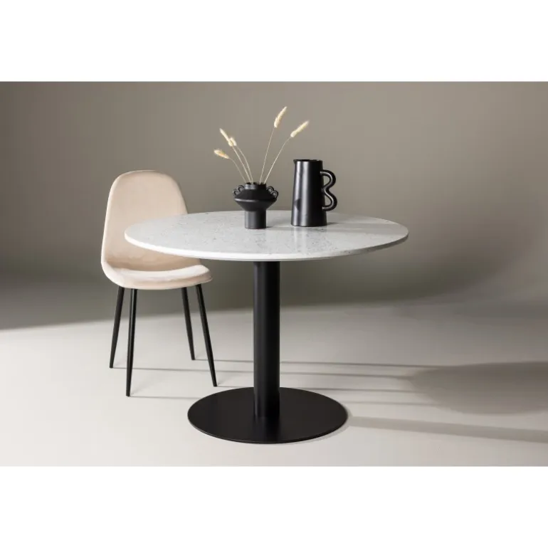 Razzia, et moderne rundt spisebord i smuk terrazzo med hvid finish og en ramme i sort metal. Her kombineres robust design med elegante former. Den runde bordplade skaber en hjemlig og indbydende atmosfære i rummet – her ender ingen på kanten! Indret smart, elegant og stilfuldt med et iøjnefaldende spisebord. Match med valgfri stole for at give din indretning et personligt præg. Plejeråd: Nye marmor- og terazzoskiver skal altid behandles et par gange i starten. Skiven skal behandles med “Protect Marble & Stone” fra Leatchermaster alternativt påføres et tyndt lag paraffinolie/hvid olie. Lad olien trænge ind i overfladen, tør derefter af og polér. Til daglig rengøring og som god beskyttelse, brug en fugtig klud og almindeligt sæbevand. Sæben danner en membran og giver en vis beskyttelse.