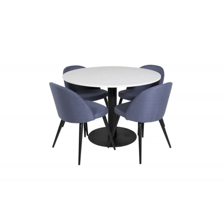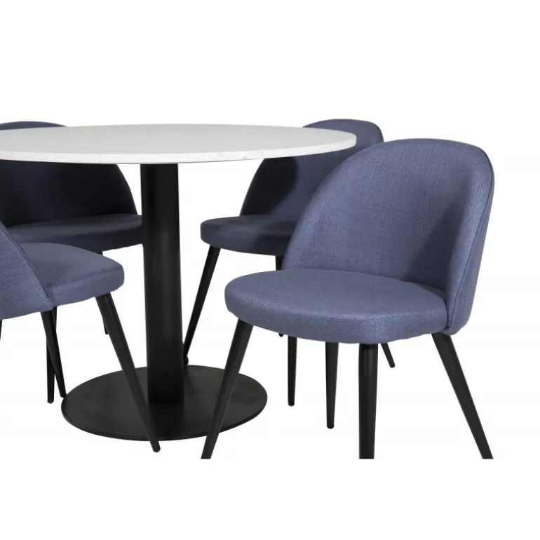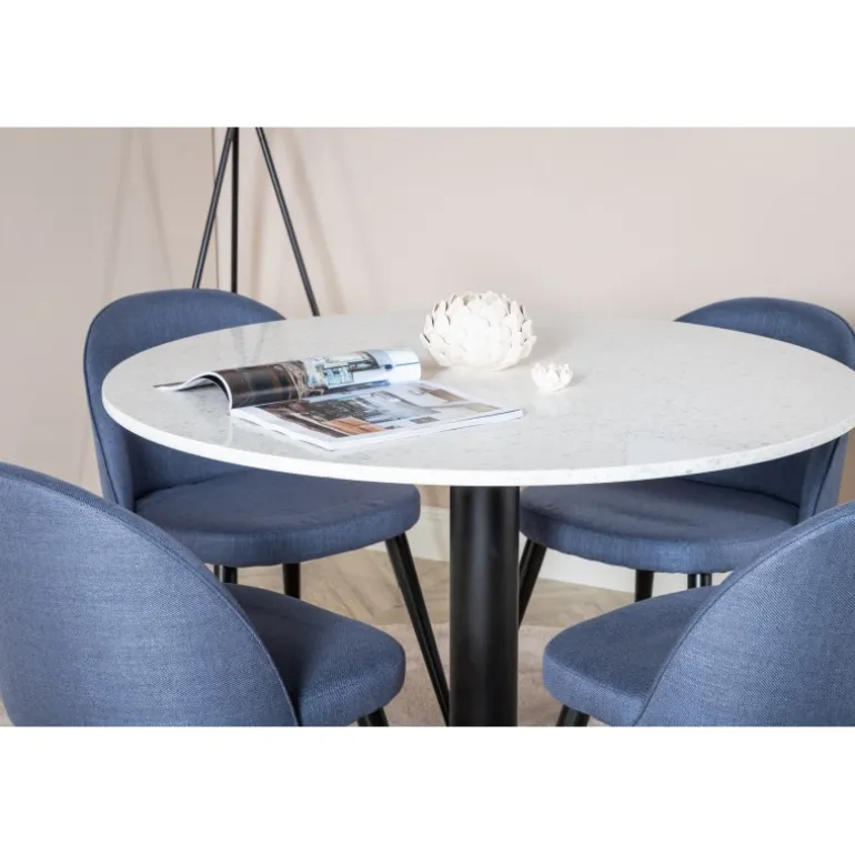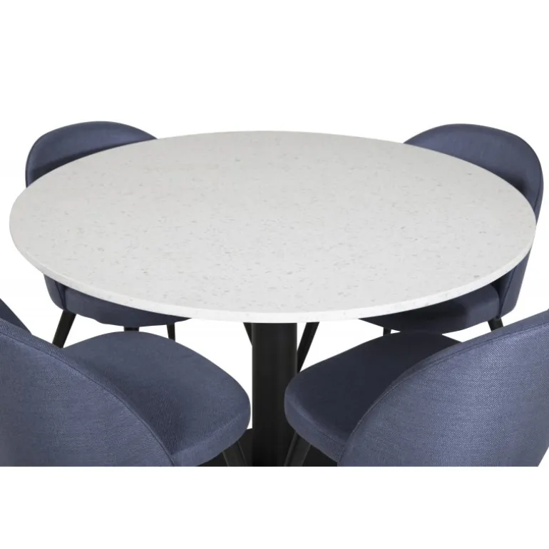 Oplev elegance og stil med vores Razzia Rund Spisebordssæt. Dette sæt inkluderer et rundt spisebord og stilfulde stole fra Velvet-serien. Med et moderne og sofistikeret design passer dette sæt perfekt ind i de fleste hjem. Bordpladen i hvid terrazzo kombineret med stole i sort eller blå polyester skaber en unik og indbydende atmosfære. Gør dine måltider til særlige øjeblikke med dette stilfulde Spisebordssæt.