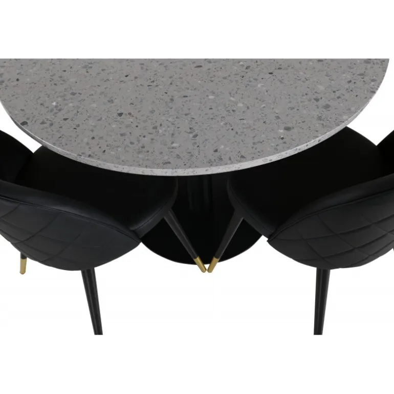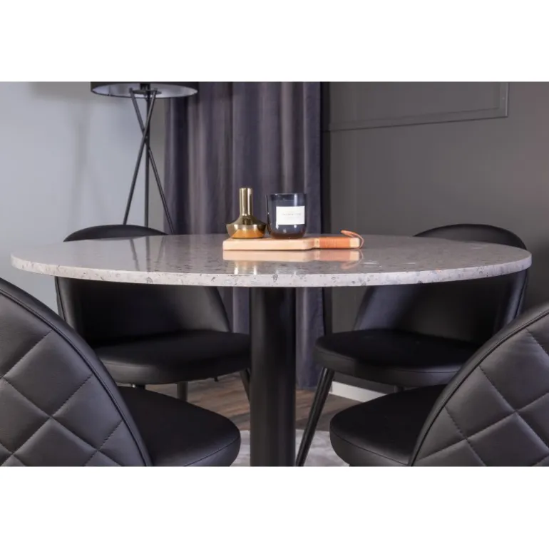 Vores moderne Razzia Rundt Spisebordssæt er en perfekt blanding af luksus og elegance, som vil gøre dit hjem til et attraktivt samlingspunkt. Sættet inkluderer en stilfuld spisebord og komfortable stole fra Velvet-serien, der tilføjer et strejf af sofistikation til enhver spisestue. Med materialer som PU, stål og terrazzo kombinerer dette sæt både holdbarhed og æstetik. Tilgængelig i farverne sort, guld og grå, passer Spisebordssættet perfekt ind i enhver moderne indretning.