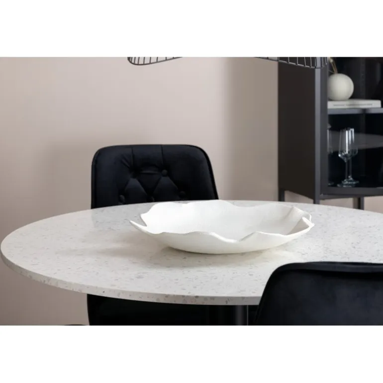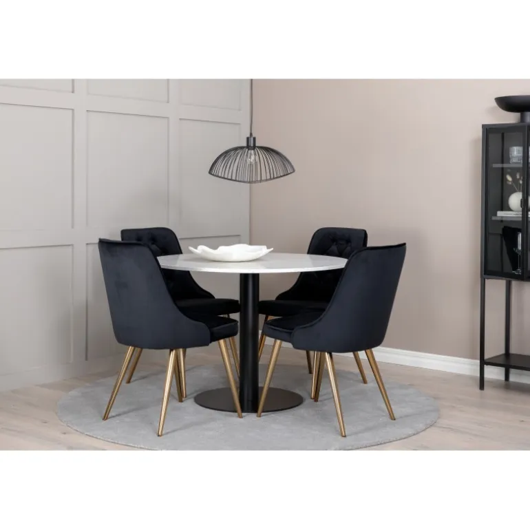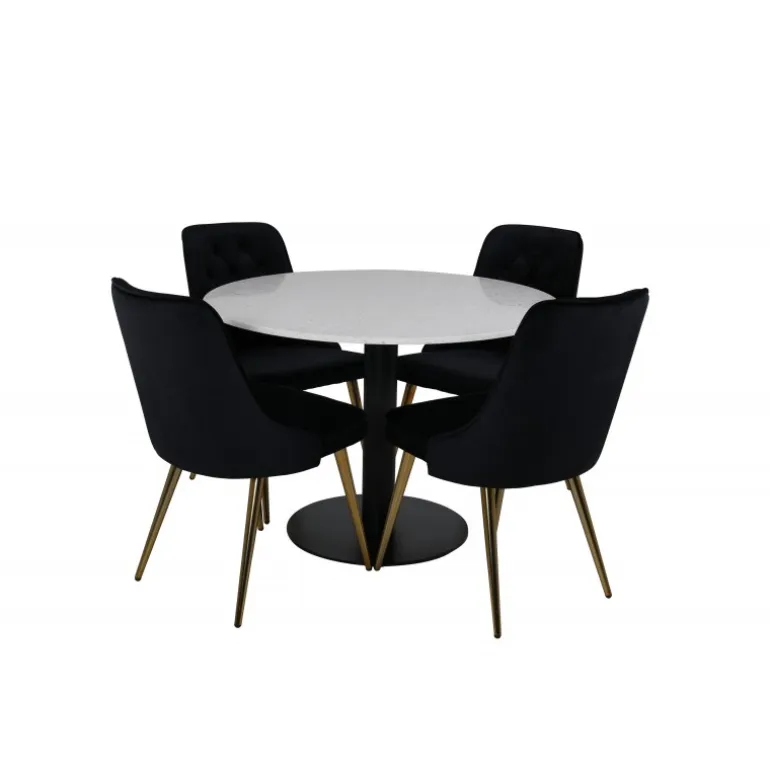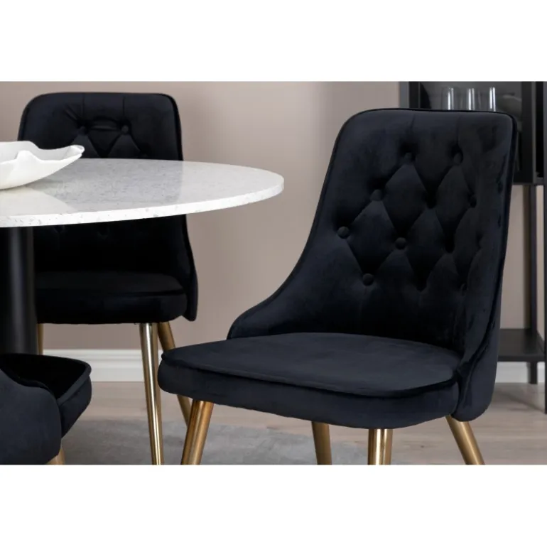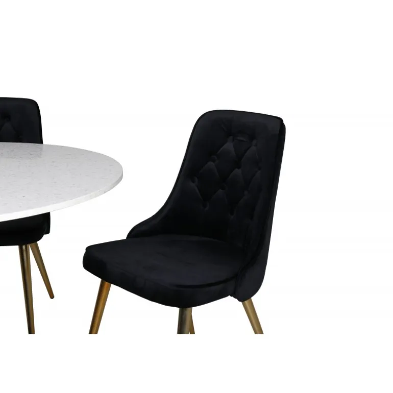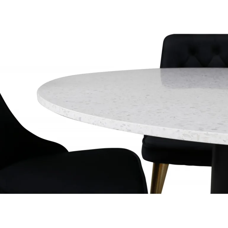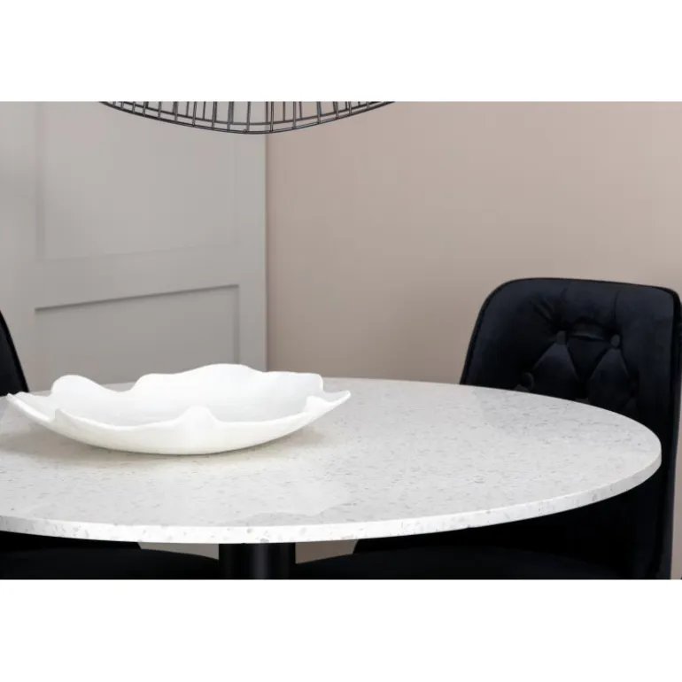 Elegant, pompøst og komfortabelt Spisebordssæt – hvad mere kan man ønske sig? Spisebordet Razzia har en rund bordplade i smuk terrazzo med hvid finish og en cylinderformet ramme i sort metal. Dette kombineres med stilfulde spisebordsstole fra Velvet Deluxe-serien. Stolen har et fuldt polstret design, ben i messingpoleret metal og en rundet ryg og sæde i lækker sort fløjlsstof med blød polstring og dekorative knapper. Her sidder du komfortabelt i lang tid!