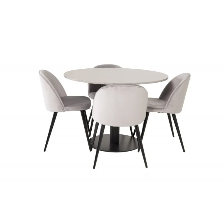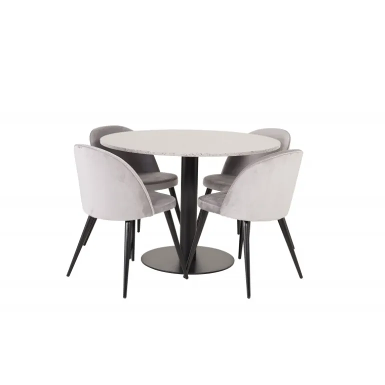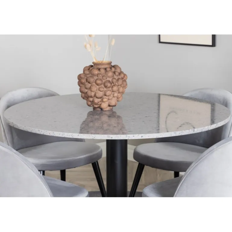Oplev Razzia Rundt Spisebordssæt, der kombinerer elegance med funktionalitet. Dette Spisebordssæt inkluderer et rundt spisebord med en marmor-lignende overflade og grå velourstole fra Velvet-serien. Perfekt til lange og hyggelige middage. Bordet er fremstillet af holdbart stål og terrazzo, mens stolene er lavet af bøjet træ, skum og stål. Med sin stilrene sorte og grå farvekombination passer sættet ind i ethvert moderne hjem.