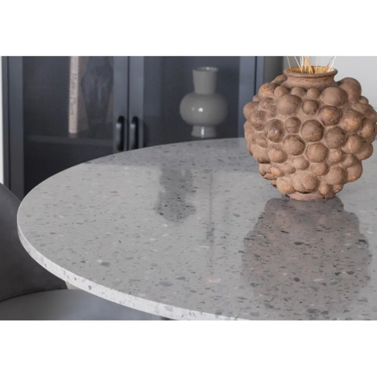 - Rundt spisebord: Marmor-lignende bordplade for et elegant udtryk.