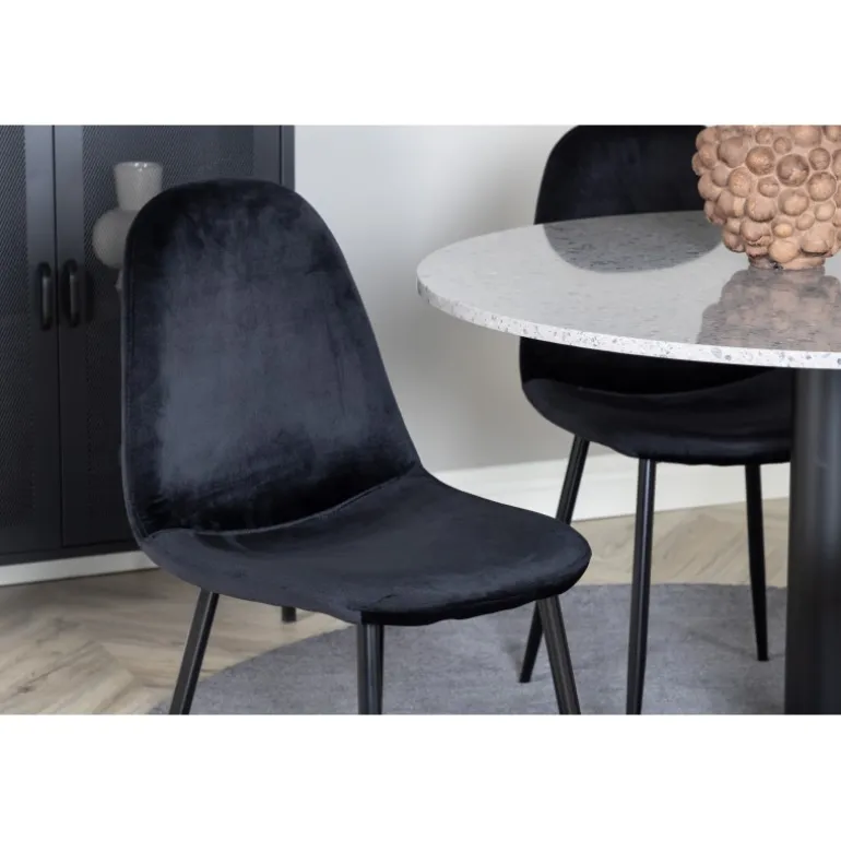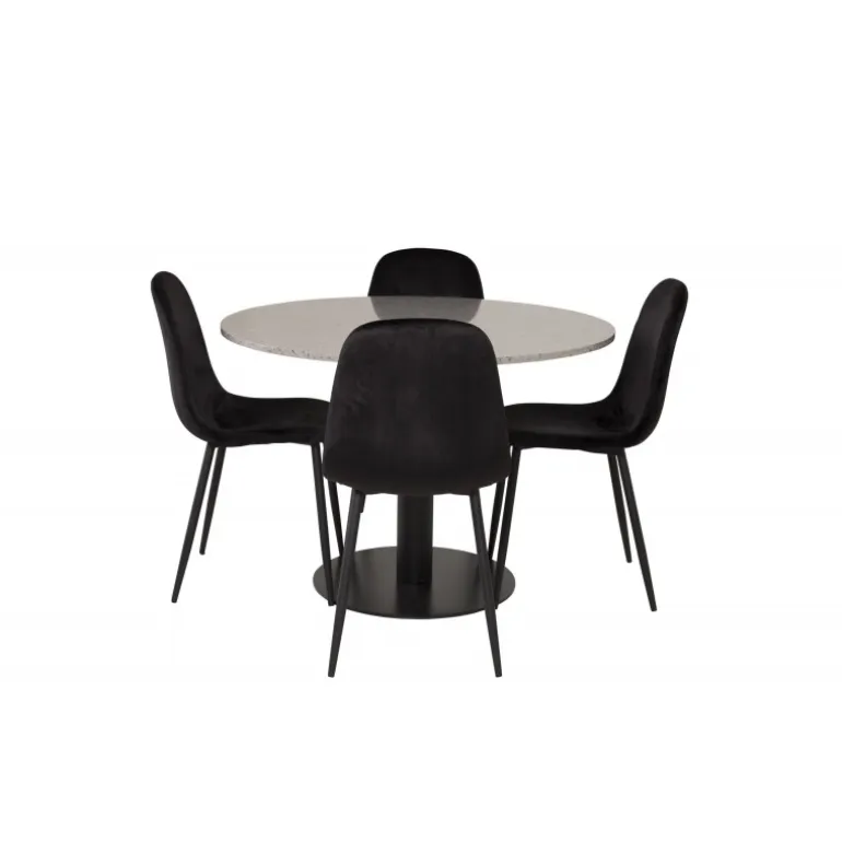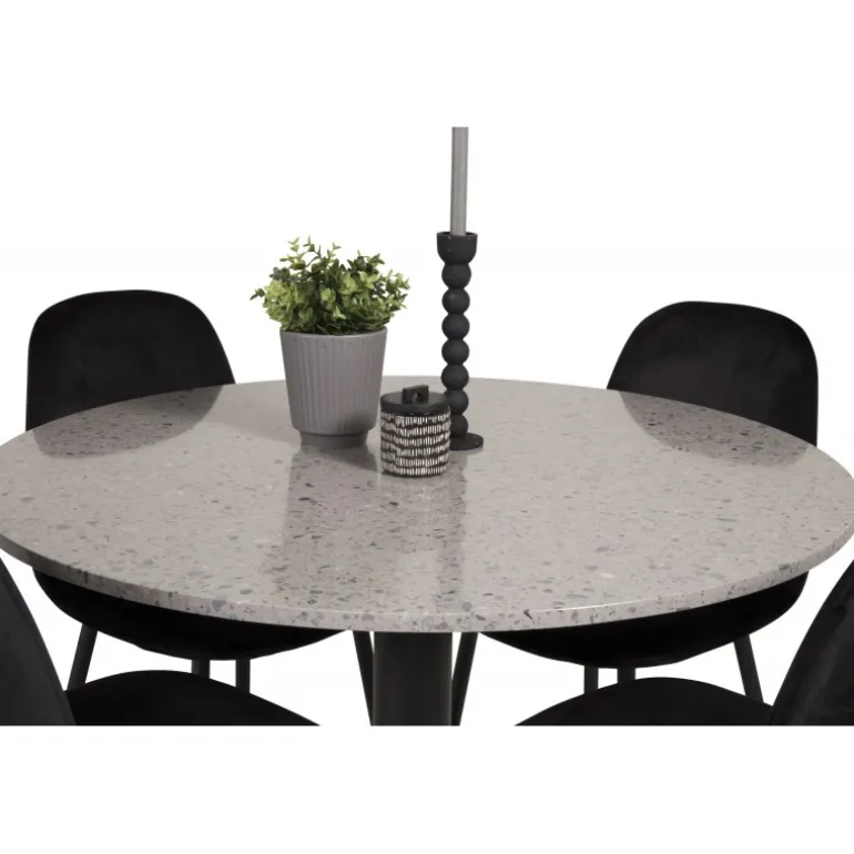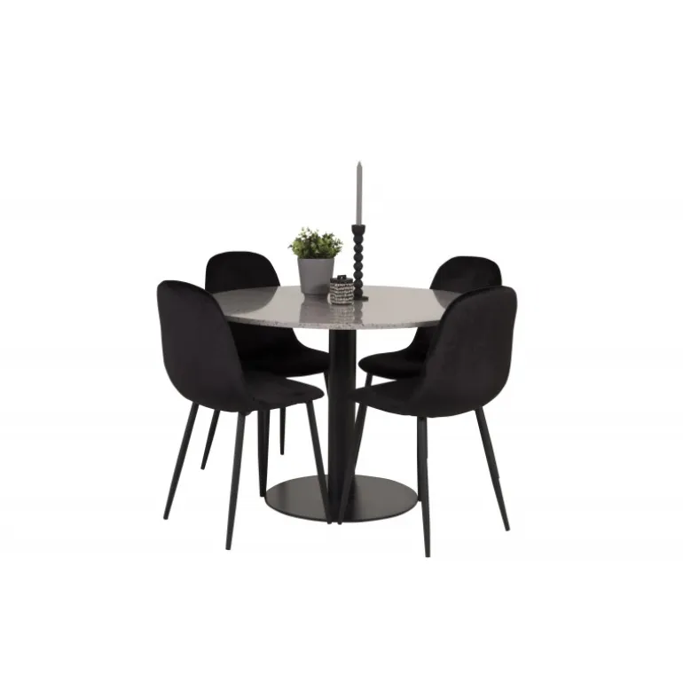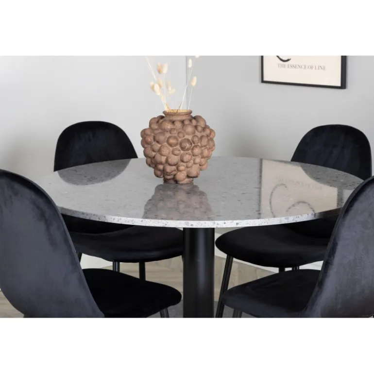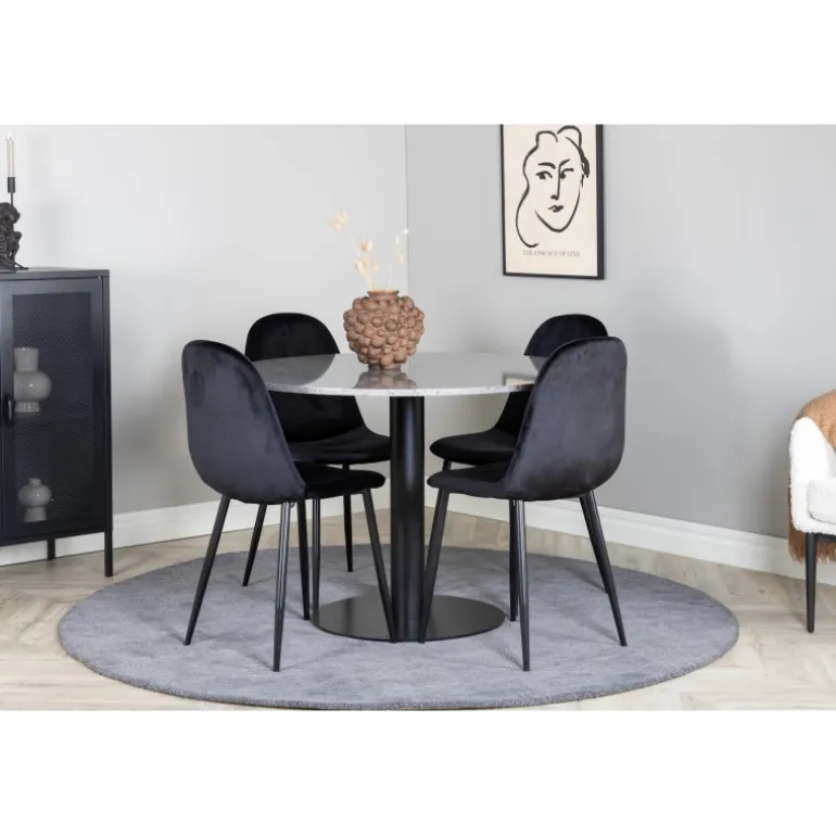 Razzia Rundt Spisebordssæt er det perfekte valg for dem, der ønsker at tilføje et strejf af luksus og elegance til deres hjem. Dette Spisebordssæt inkluderer et rundt spisebord med en marmor-lignende bordplade og sorte velourstole fra Polar-serien. Kombinationen af grå bordplade og sorte stole skaber et sofistikeret udtryk, der vil imponere dine gæster. Spisebordet er fremstillet af holdbart stål og terrazzo, mens stolene er lavet af bøjet træ, skum og stål for optimal komfort og stabilitet.