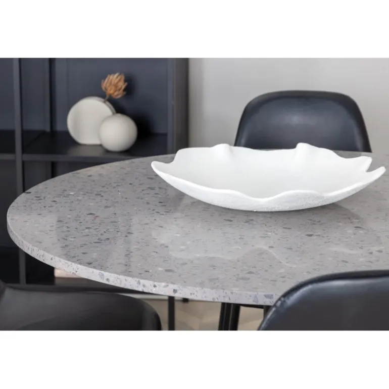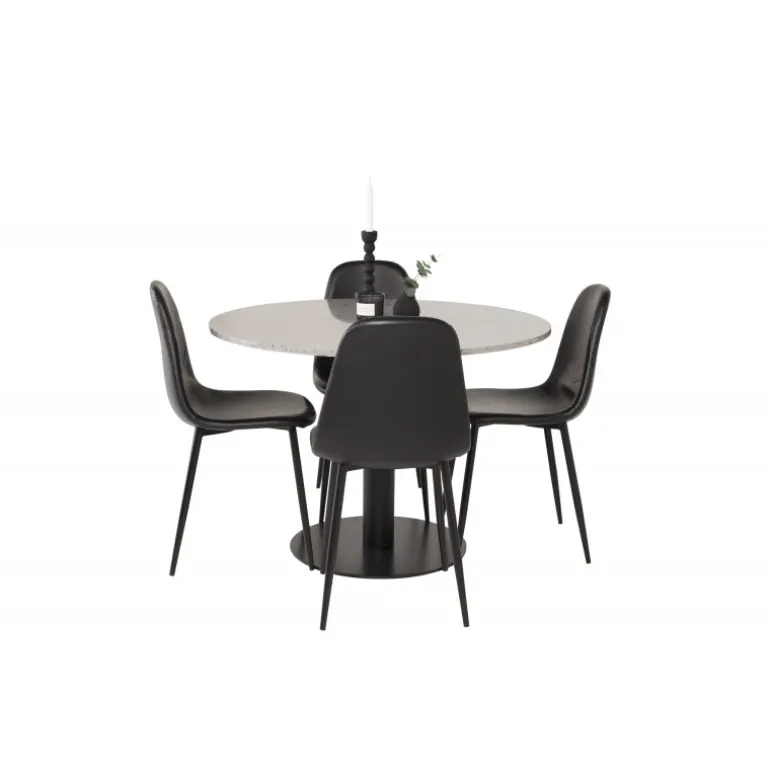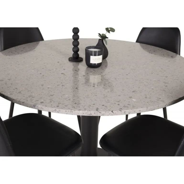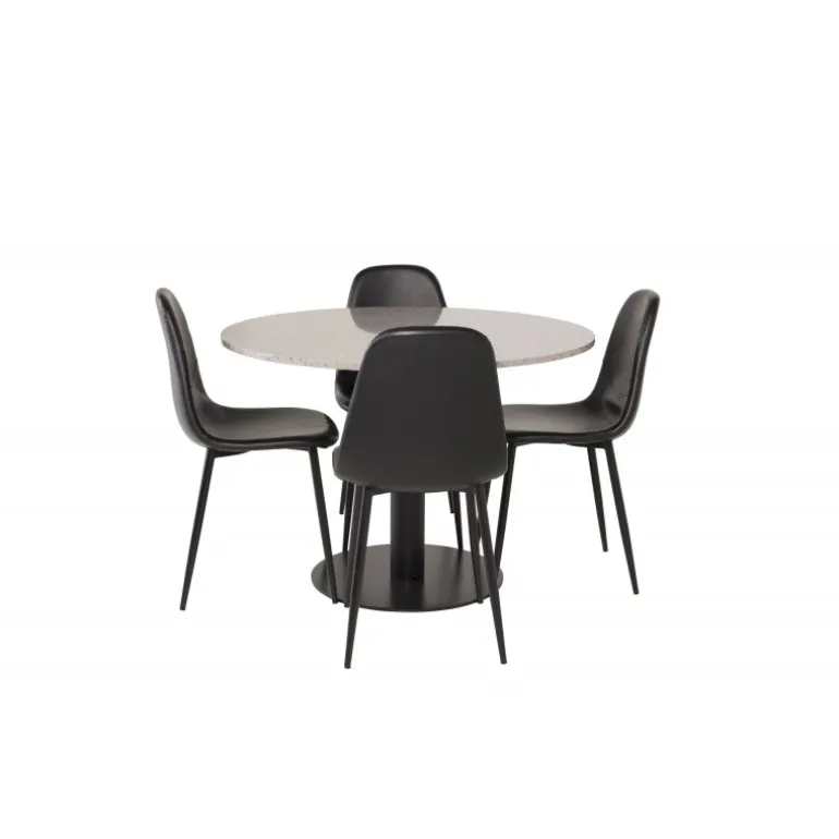 Razzia Rundt Spisebordssæt er et elegant og enkelt valg til dit hjem. Dette sæt kombinerer bord fra Razzia-serien og stole fra Polar-serien, hvilket giver et neutralt og alsidigt design, der passer ind i de fleste miljøer. Med sit minimalistiske udseende skaber det en følelse af enkelhed og ro i dit spiseområde. Bordet har en grå terrazzo bordplade og stålben, mens stolene er lavet af bøgetræ, skum og PU, hvilket sikrer både komfort og holdbarhed. Vær opmærksom på, at montering er påkrævet.