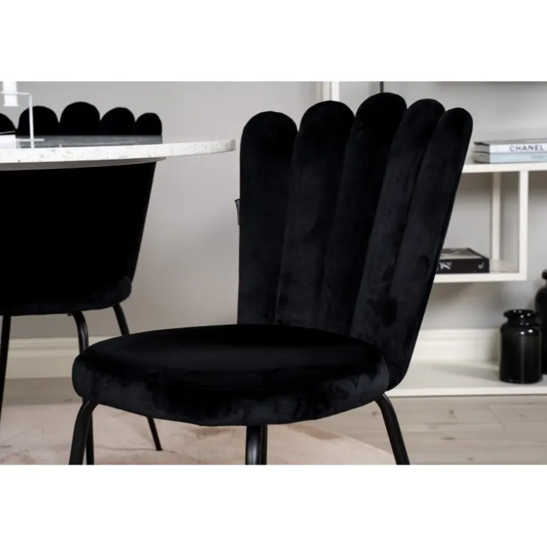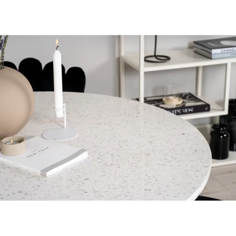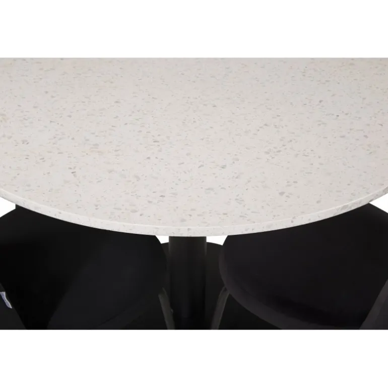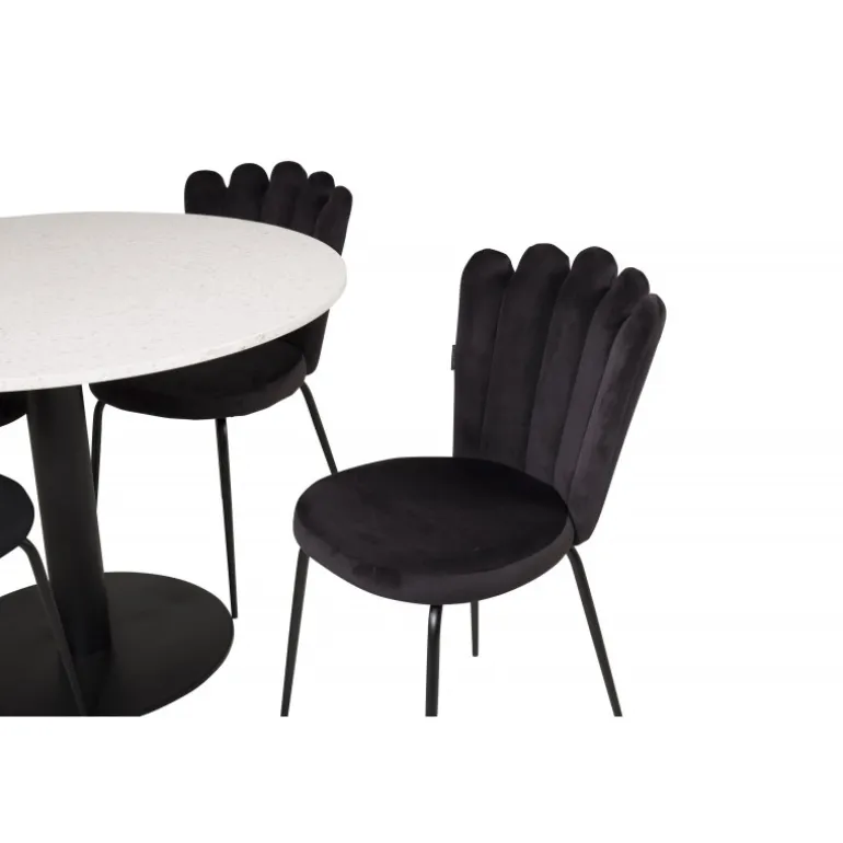 Oplev luksus og komfort med Razzia Rundt Spisebordssæt. Dette stilfulde Spisebordssæt fra Limhamn-serien inkluderer et elegant spisebord med en hvid Terrazzo bordplade og bløde velourstole, som skaber en hyggelig atmosfære i dit hjem. Med dets sort/hvide farvetema og robuste stålramme er dette Spisebordssæt både holdbart og æstetisk tiltalende. Perfekt til lange middage med venner og familie!