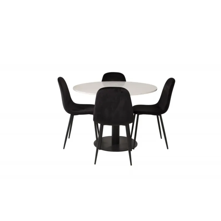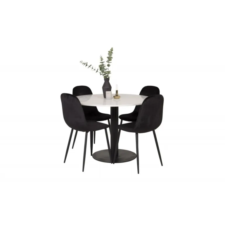 - Moderne Farver: Bordet i hvid og sort, stole i sort.
