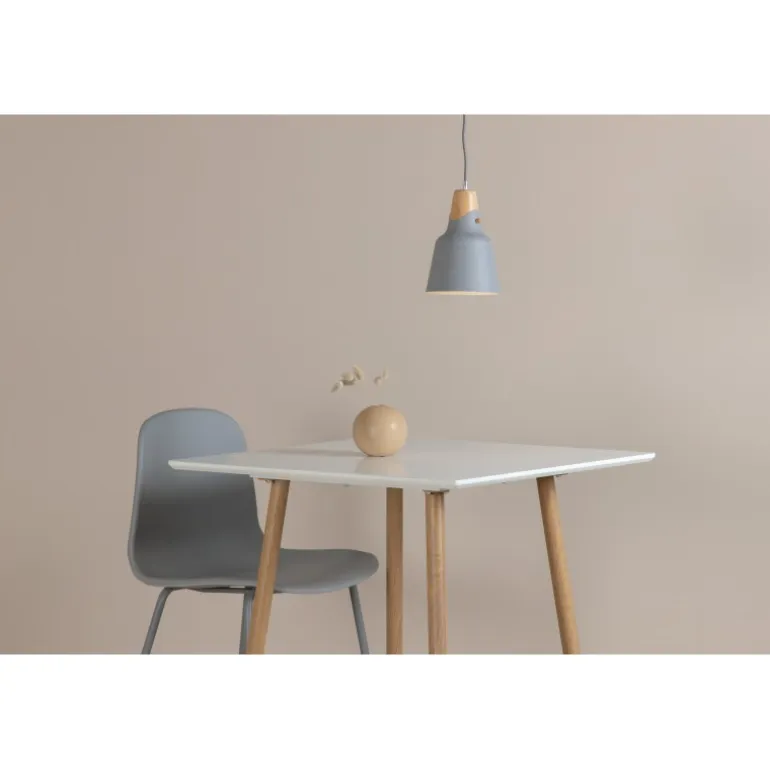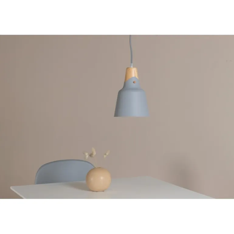 - Moderne design: Lampeskærm i grå aluminium med valnødfarvet top.