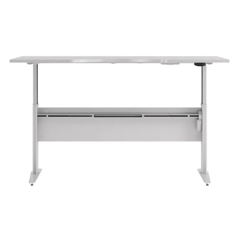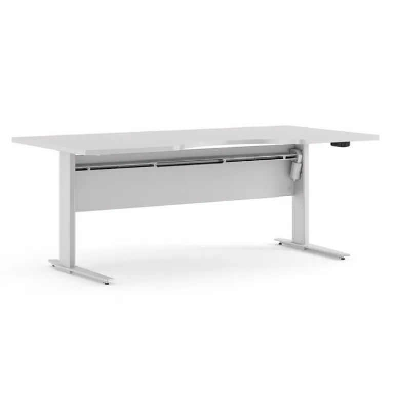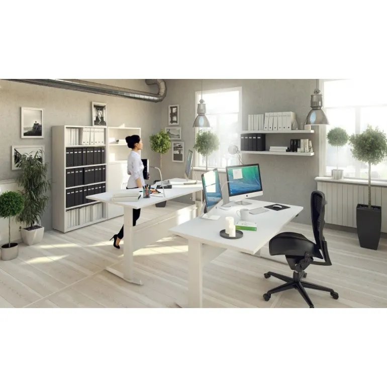 Rio hæve/sænke skrivebord med hvid MDF bordplade og hvide stålben. Kvalitet, funktionalitet og design går op i en højere enhed i dette smarte skrivebord, der tilfører kontoret en indbydende arbejdsplads.