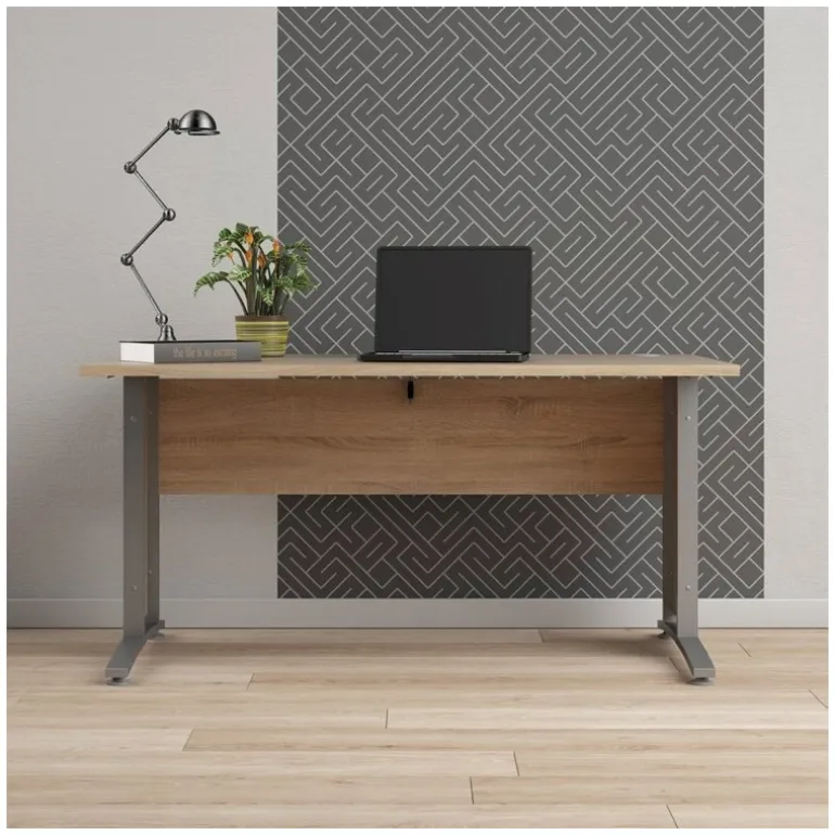 Enkelt og rummeligt Rio skrivebord i eg struktur og stål, der passer perfekt til hjemmekontoret. Skrivebordet er solidt udført og stellet har justerbare fødder, så du let kan få bordet til at stå helt lige.