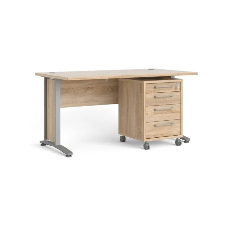 Rio skrivebord i Eg struktur med sølvgrå stålben, der let kan justeres, så bordet kommer til at stå helt lige. Ideelt skrivebord til hjemmekontoret. Skuffesektion med hjul og lås medfølger.