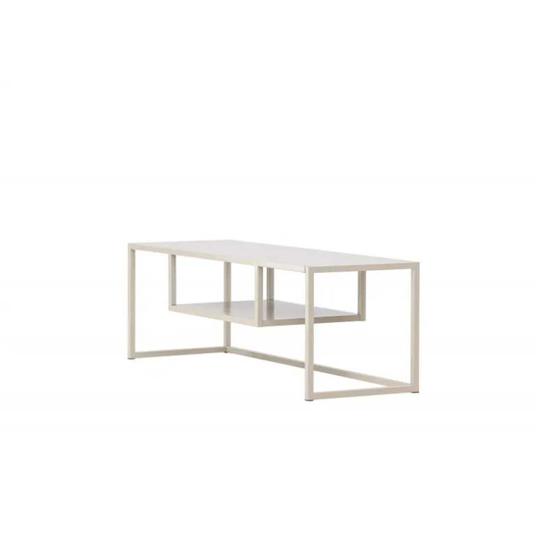 - Minimalistisk design: Rektangulær bordplade og slank base i holdbart beige stål.