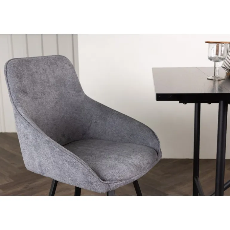 Det skal føles dejligt at samles omkring spisebordet – indret dit hjem med trendsikre spisebordsstole fra Rosie-serien! Denne lækre stol i skandinavisk design har et fuldt polstret sæde med integrerede armlæn i gråt stof og let udfladede stoleben i sort metal. Det bløde sæde er polstret for ekstra komfort og inviterer til lange hyggelige middagsstunder. Match med et flot spisebord, så du får en komplet spisestuegruppe til hjemmets hjerte!