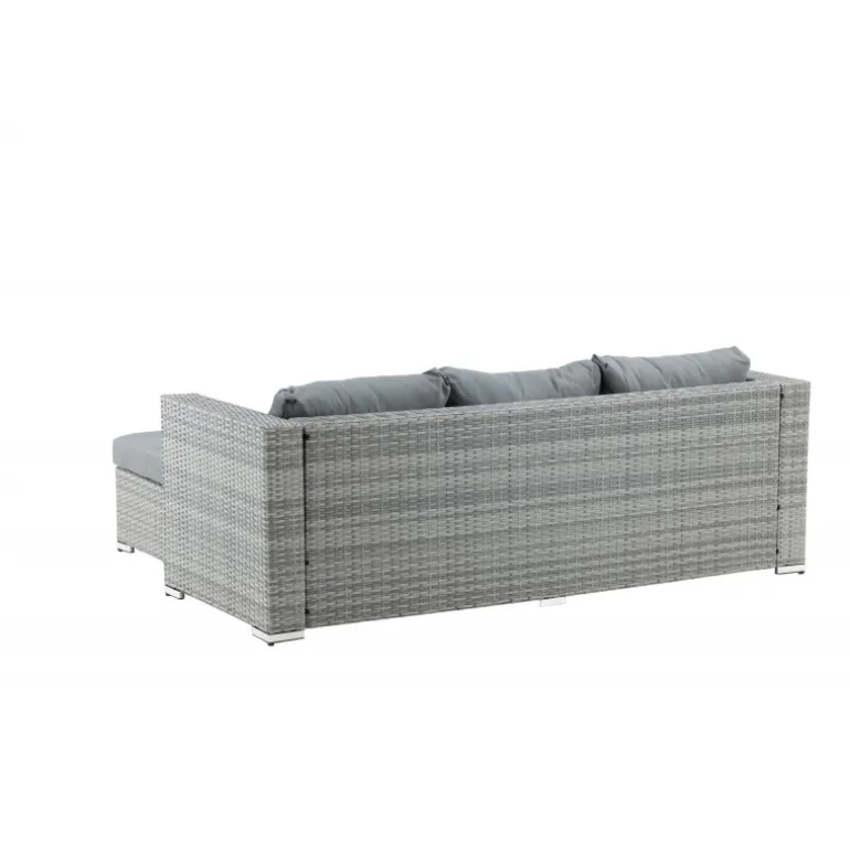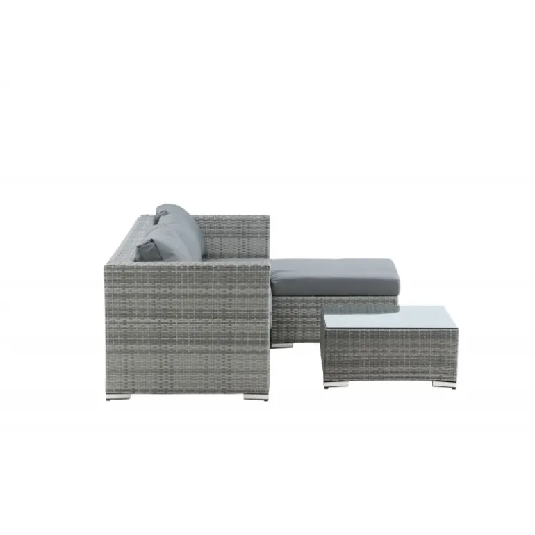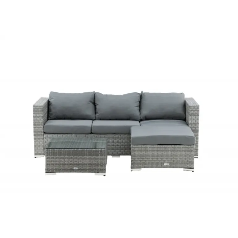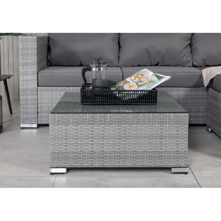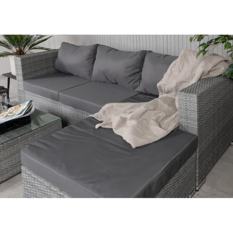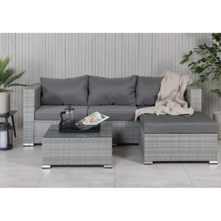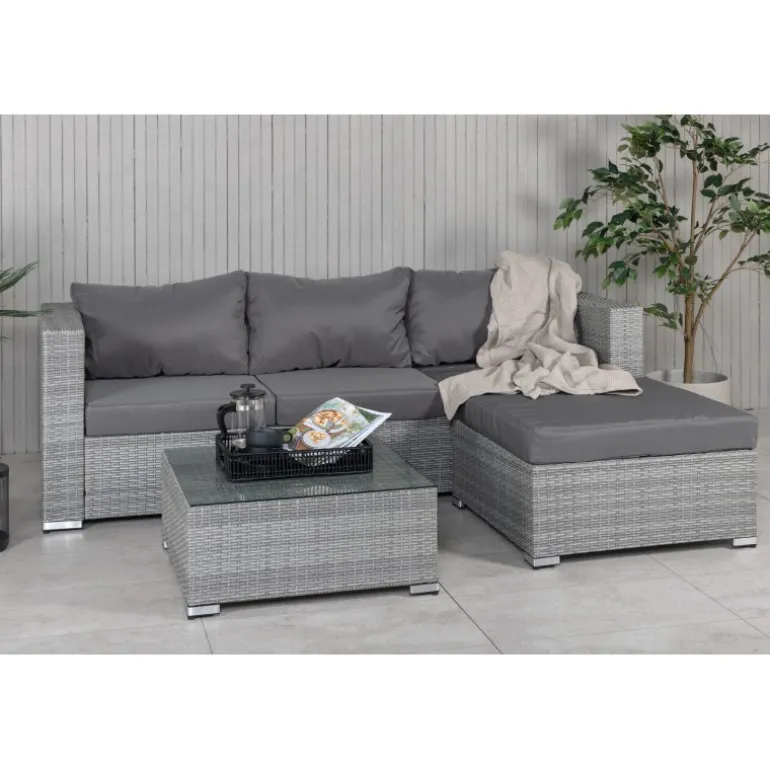 - Komfort: Inkluderer komfortable grå hynder, perfekt til lange samtaler udendørs.