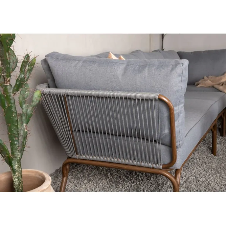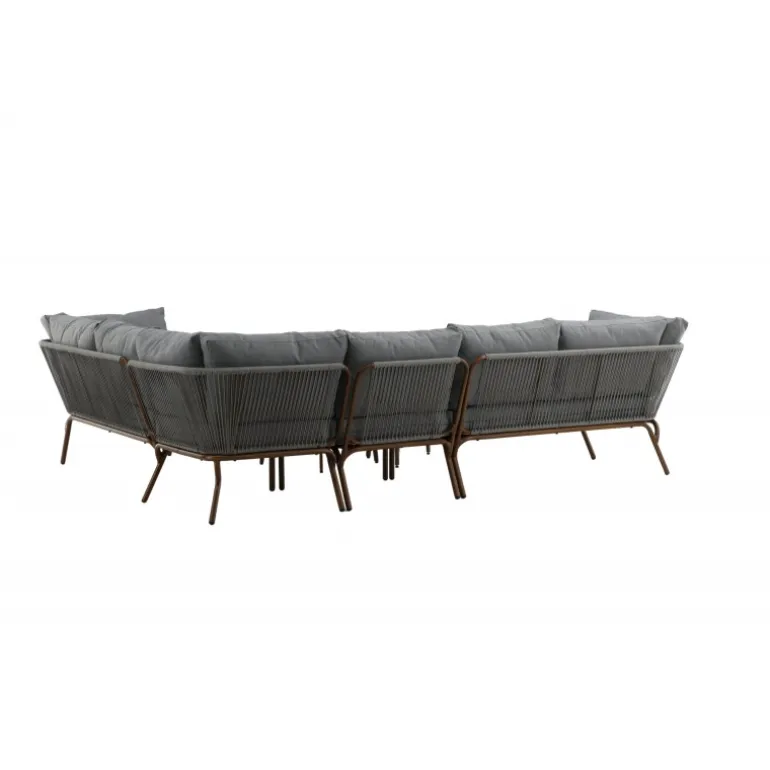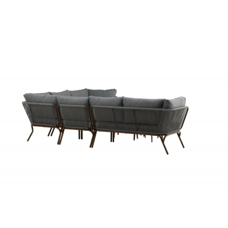 Skab et hyggeligt sted at samle dine kære denne sommer – her sidder du afslappet og komfortabelt i timevis! Roxo er en trendy sofagruppe i stilfuldt design, der er perfekt til terrassen eller udendørsområdet. Sofagruppen består af en hjørnesofa med 5 sæder og en hjørnedel, lavet af et holdbart design i brun pulverlakeret metal med en ryg designet i lysegråt reb og stilfuldt batchbord i tre dele i brunlakeret træ. Grå bløde puder er inkluderet til sofagruppen! Plejeråd: Udendørsmøbler i aluminium og rustfrit stål skal rengøres regelmæssigt med vand og mild sæbe. Skyl altid grundigt med rigeligt vand, hvilket bliver ekstra vigtigt, hvis møblerne er placeret tæt på havet, hvor salt kan transporteres gennem luften.
