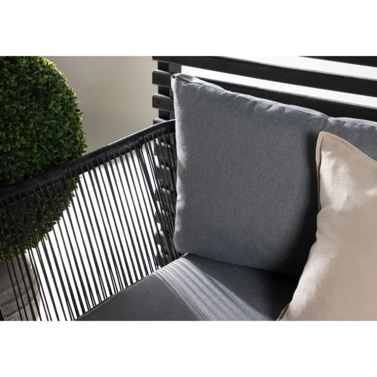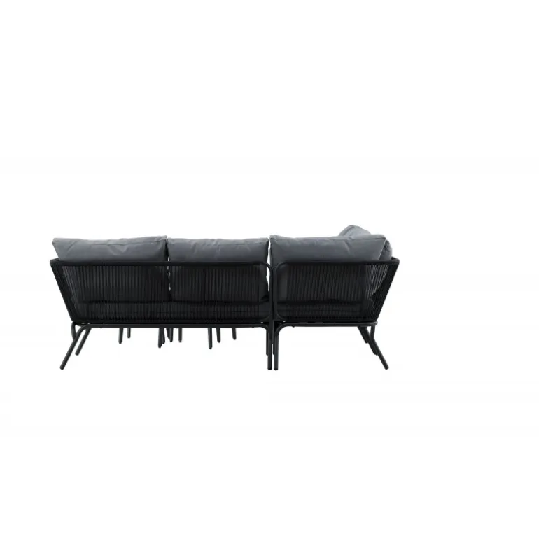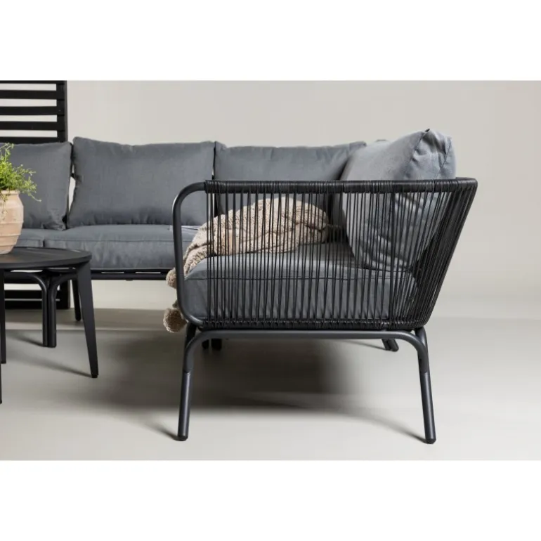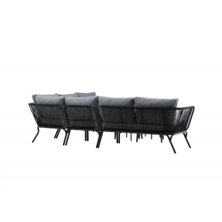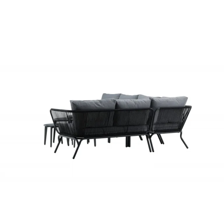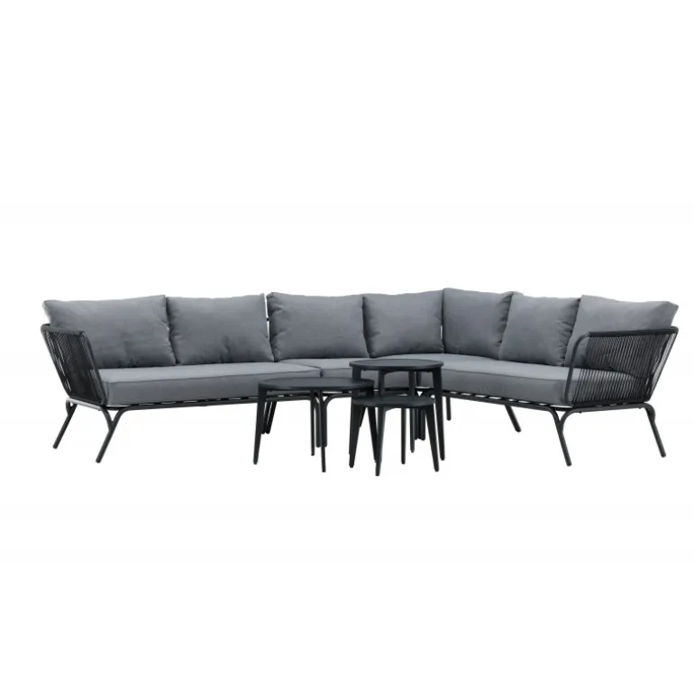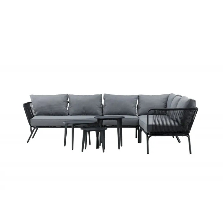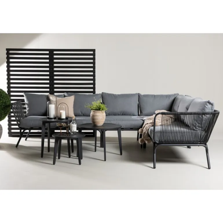 Skab et hyggeligt sted at samle dine kære denne sommer – her sidder du afslappet og komfortabelt i timevis! Roxo er en trendy sofagruppe i stilfuldt design, perfekt til terrassen eller udendørsområdet. Sofagruppen består af en hjørnesofa med 6 siddepladser og en hjørnedel, fremstillet i holdbart sort aluminium med ryglæn i sort reb og stilfulde sæt borde i tre dele med bordplader i sort aluminium. Grå bløde puder medfølger til sofagruppen. Mål for borde: 50/36/43×50/42/60 cm. Mål for sofa: 63x63x70 cm. Siddemål: 255x64x29,5 cm. Plejeanvisning: Udendørsmøbler i aluminium og rustfrit stål bør rengøres regelmæssigt med vand og mild sæbe. Skyl altid grundigt med rigeligt vand, hvilket bliver ekstra vigtigt, hvis møblerne er placeret tæt på havet, hvor salt kan blive transporteret gennem luften.