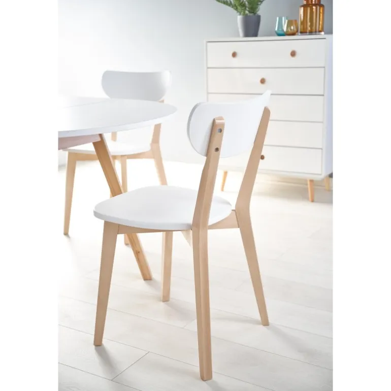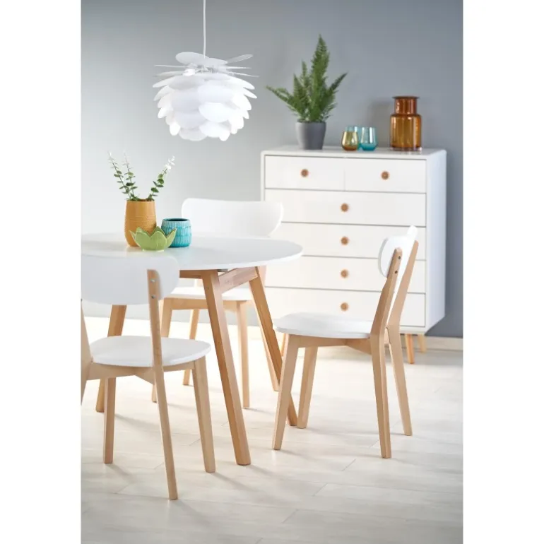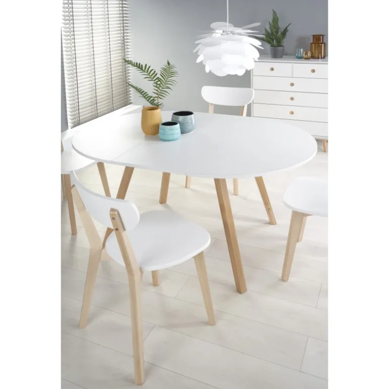 Oplev RUBEN forlængelsesbord – det ideelle valg til både små og store hjem. Dette elegante bord er designet med praktisk funktionalitet og stil i tankerne. Med dimensioner på 102-142/102/73 cm kan bordet nemt forlænges, så du kan have plads til flere gæster. Bordpladen er lavet af lamineret MDF, mens benene er af massivt bøgetræ, hvilket giver bordet en robust og holdbar konstruktion. Den hvide top og de honningfarvede ben tilføjer et moderne touch til enhver spisestue.