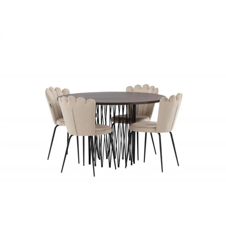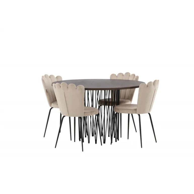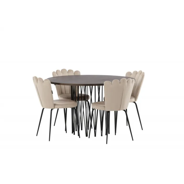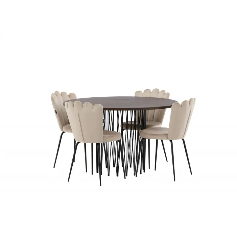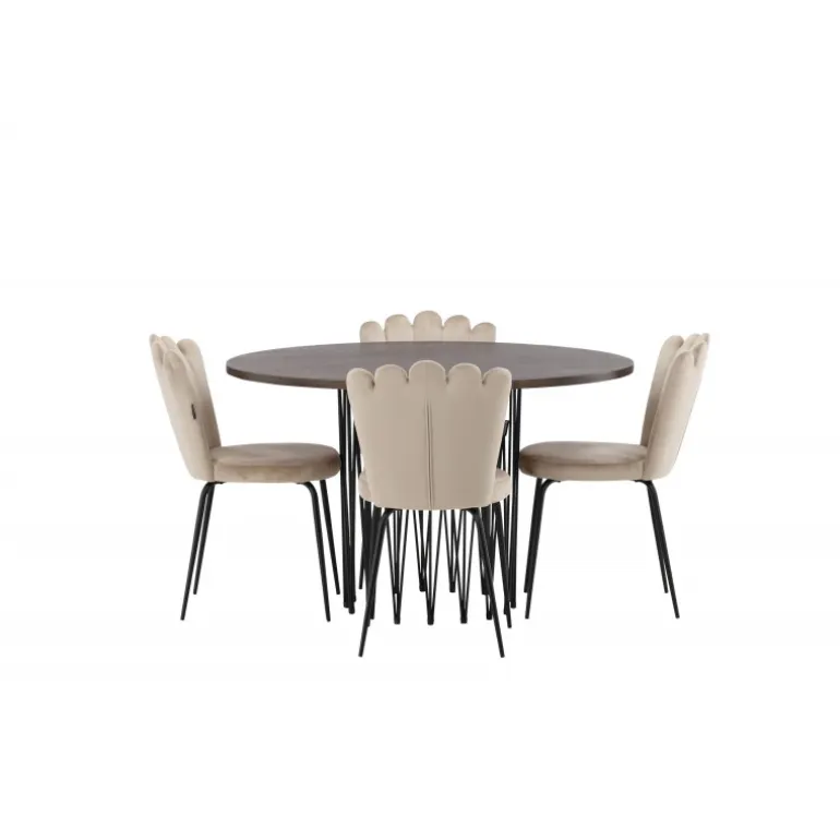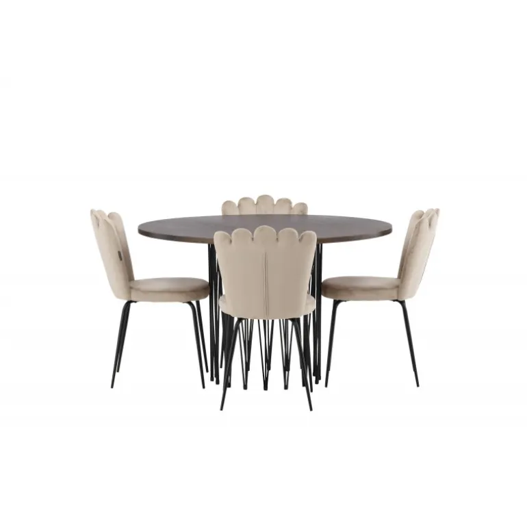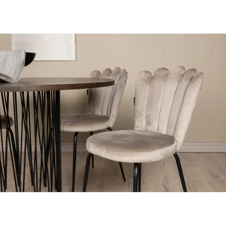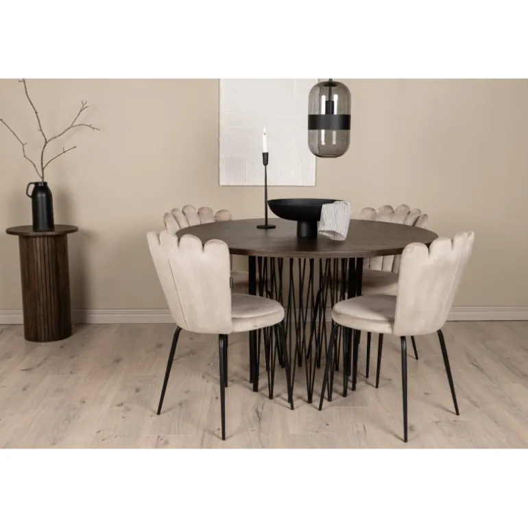 En Spisebordssæt hvor ingen ender på kanten – lige så smart som den er luksuriøs! Vores runde spisebord i Sten har et fantastisk, skandinavisk design, der passer til selskabet. Bordet har en smuk brunfarvet bordplade i MDF med finer og en dekorativ cylinderformet ramme i sort metal. Her i perfekt kombination med vores iøjnefaldende stole fra Limhamn serien. Stolen er en moderne favorit i mange husholdninger med sit indbydende design, dekorative muslingeformede ryg med dekorative syninger og en rund sæde i smagfuldt beige fløjlstof. Benene er i sort pulverlakeret metal. Sid behageligt og storslået!