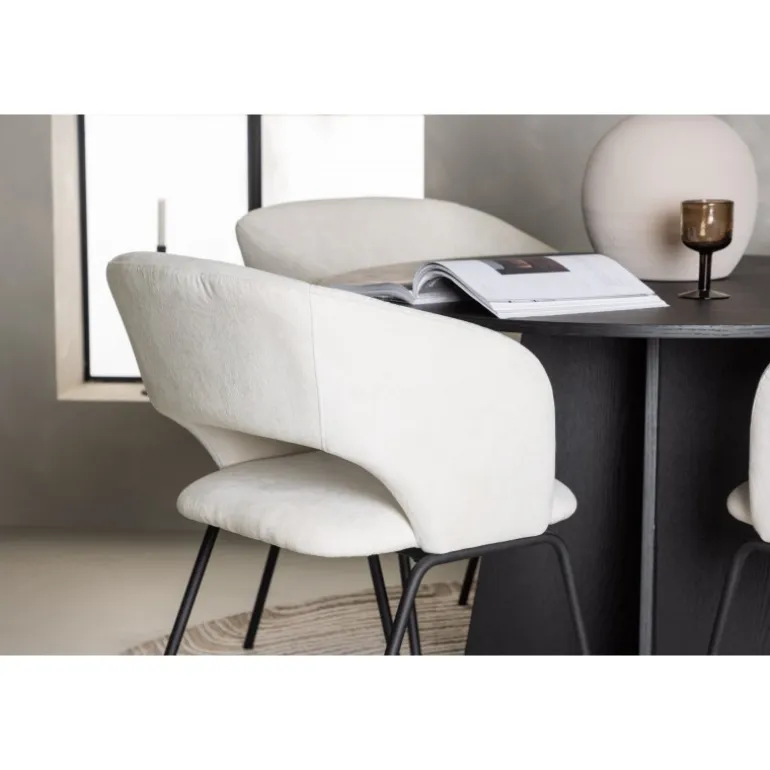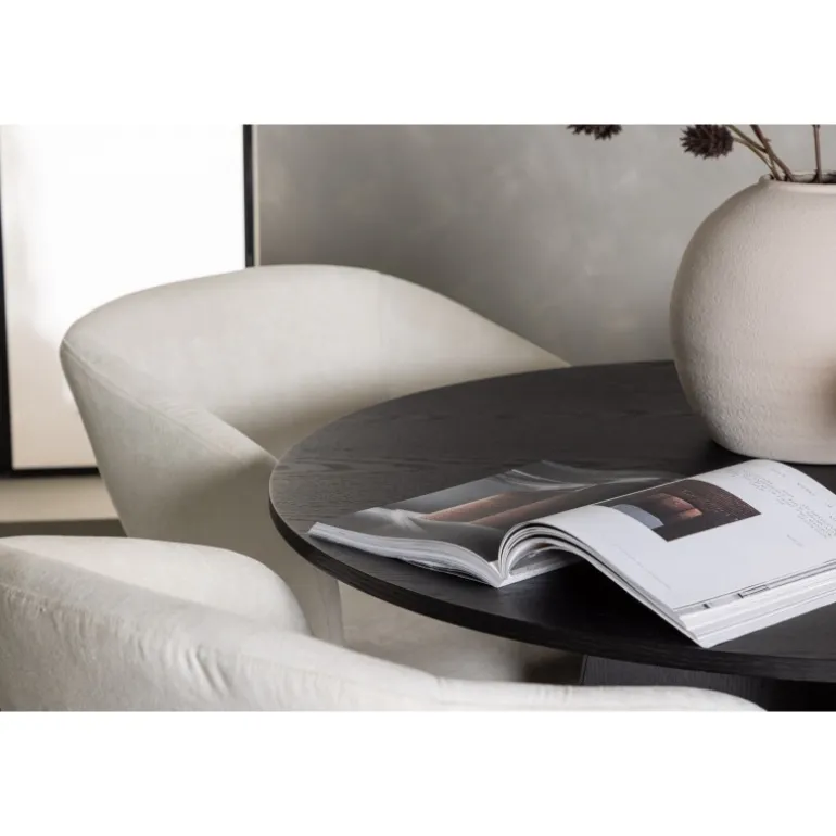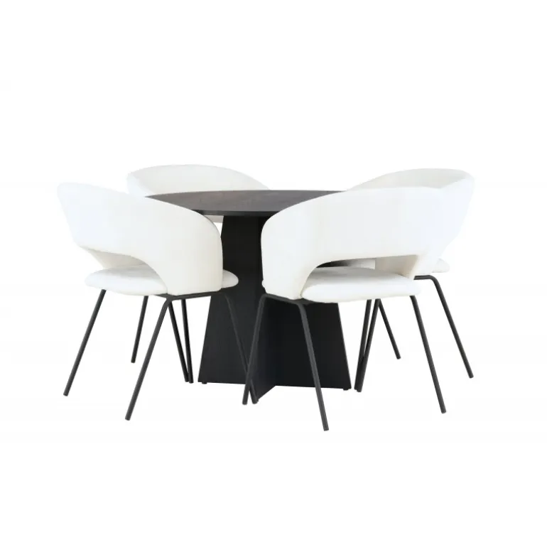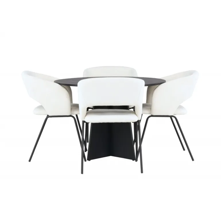 Skab en moderne atmosfære i dit hjem med et rundt Spisebordssæt! Velkommen hjem til en hyggelig og indbydende følelse. Vores runde spisebord, Bootcut, er stilfuldt designet med en sort MDF finerbordplade og en robust ramme af samme materiale. Bordets smarte størrelse gør det til et ideelt sted for måltider og sociale sammenkomster, hvor ingen ender på kanten. Bordets diameter: 110cm. Her er Bootcut-bordet kombineret med vores vidunderlige stole fra Day-serien. Day-stolene kombinerer gennemtænkt design, bløde former og en minimalistisk struktur for at skabe en perfekt siddeoplevelse. Med fuldt polstrede sæder og en åben rygstøtte tilbyder Day-stolene exceptionel komfort, samtidig med at de udstråler en moderne og luksuriøs stil. Day-stolene er polstret i elegant hvidt linnedstof, og de slanke stoleben i sort stål skaber en elegant kontrast, der fremhæver stolens strømlinede udseende. Med disse stole vil du hæve stilniveauet i dit hjem og skabe en indbydende atmosfære, der imponerer både familie og venner. Her får du virkelig en perfekt kombination af stil og komfort!