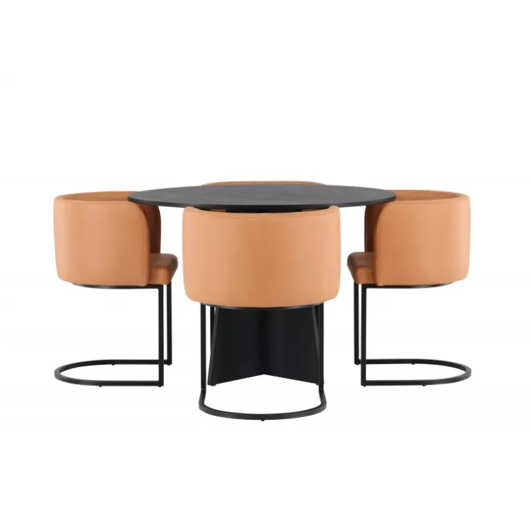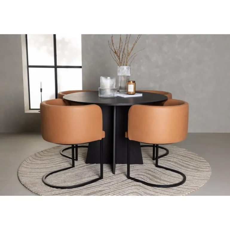 Kan det blive mere stilfuldt end dette? Dette Spisebordssæt i rustik og moderne stil imponerer med sit gennemtænkte design og høje komfort! Vores runde spisebord, Bootcut, bliver hjertet i dit hjem. Med sin runde sorte MDF finer bordplade udstråler det en følelse af selvtillid og sofistikation. Bordets designrige base er en fryd for øjet og tilføjer et elegant touch til helhedsindtrykket. Sammen med de brune stole fra Simrishamn-serien bliver din spiseoplevelse komplet. Disse stole er ikke kun stilfulde, men også utroligt komfortable. Med deres fuldt polstrede sæder og runde brune TC stofryglæn tilbyder de den perfekte kombination af komfort og elegance. De minimalistiske sorte stålben tilføjer et moderne og slankt touch til din spisestue. Her får du ikke blot et Spisebordssæt, men også en festlig atmosfære i din stue. Her kan du og din familie nyde god mad og godt selskab!