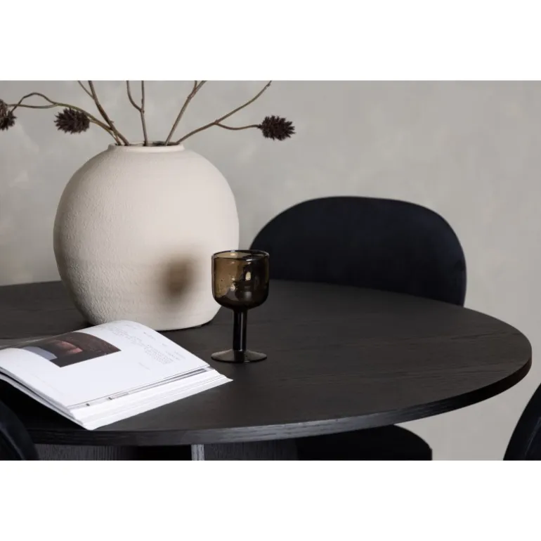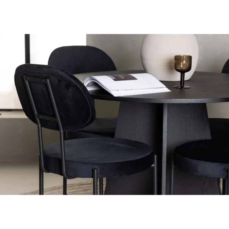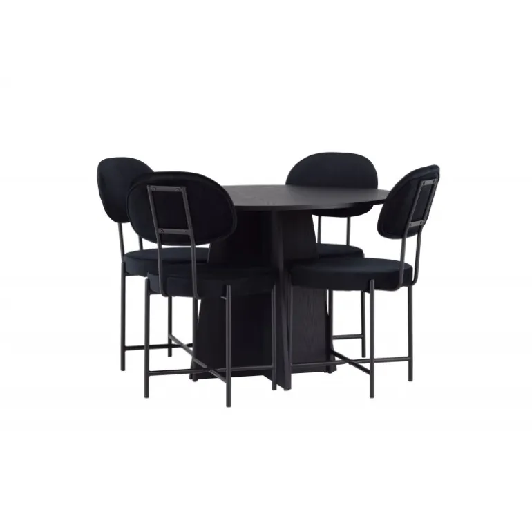 Skab en moderne atmosfære i din stue med dette velkendte Spisebordssæt i skandinavisk stil! Vores runde spisebord, Bootcut, er det perfekte valg for at skabe den vidunderlige følelse af fællesskab – ingen ender ved kanten. Med sin runde bordplade og røgfarvede sorte farve giver det ikke kun et indbydende indtryk, men udstråler også en elegant og moderne stil. Lavet af MDF med finer, tilbyder bordet holdbarhed og kvalitet, der varer over tid. Borddimensioner: 110 cm. Vores matchende stole fra Stella-serien forbedrer oplevelsen med deres trendy skandinaviske design. Stolene giver ikke kun en behagelig komfort, men tilføjer også et strejf af luksus med deres sorte fløjlsstof og minimalistiske sorte stålben. Her kan hvert måltid blive en fest. Inviter familie og venner til lækre måltider i fremtiden og nyd den stilfulde atmosfære, som Spisebordssættet bidrager til!