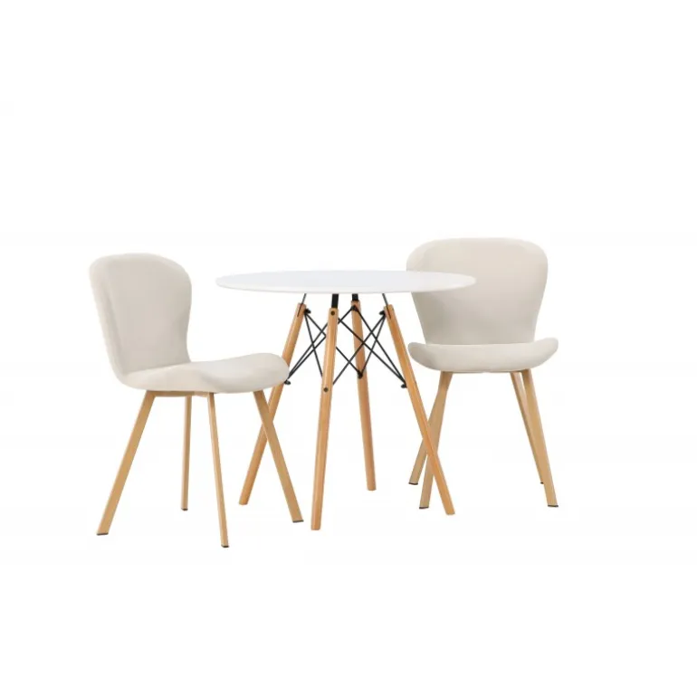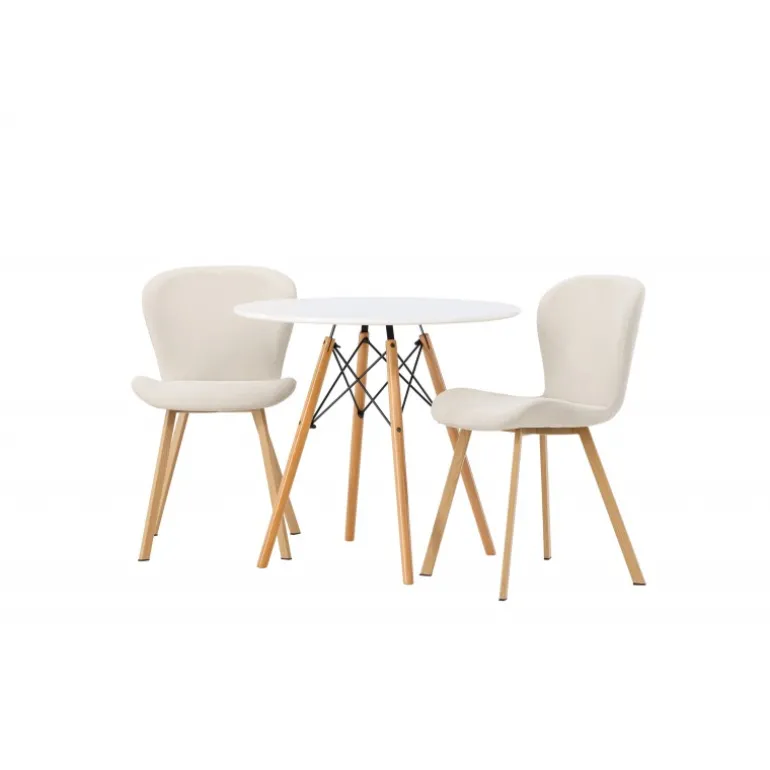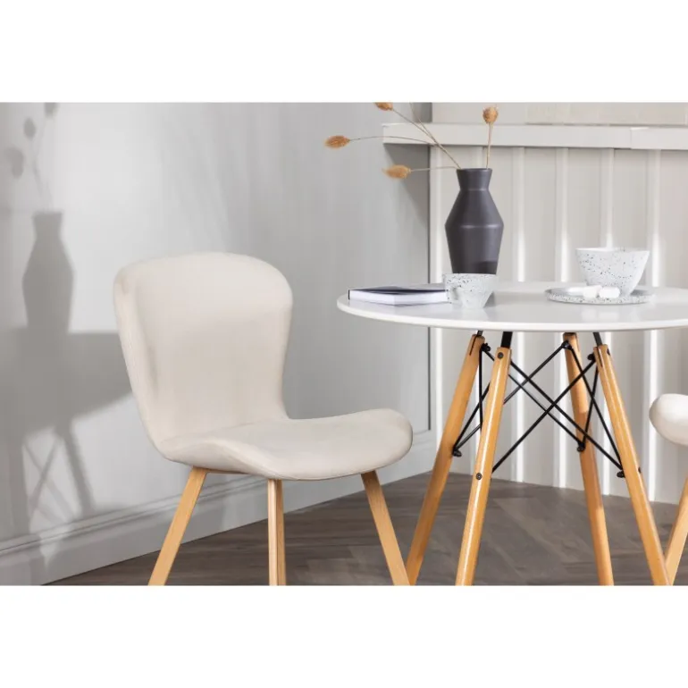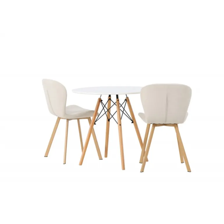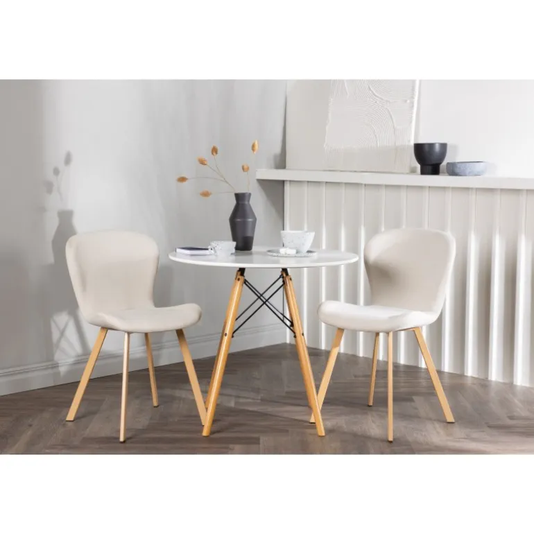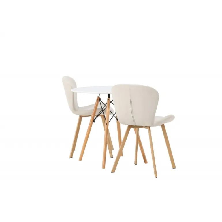 Dette charmerende sæt udstråler luksus! Det runde spisebord Danburi har et klassisk design med en rund bordplade i hvid MDF og let flarede ben i bøgetræ med dekorative detaljer i sort stål. Her i en vidunderlig kombination med beige spisestuestole fra Lilja-serien. Stolen har et smidigt rundt design med et sæde i beige polyesterstof og let flarede ben i sort metal. Sid behageligt uden at gå på kompromis med stilen! Borddiameter: 60cm.