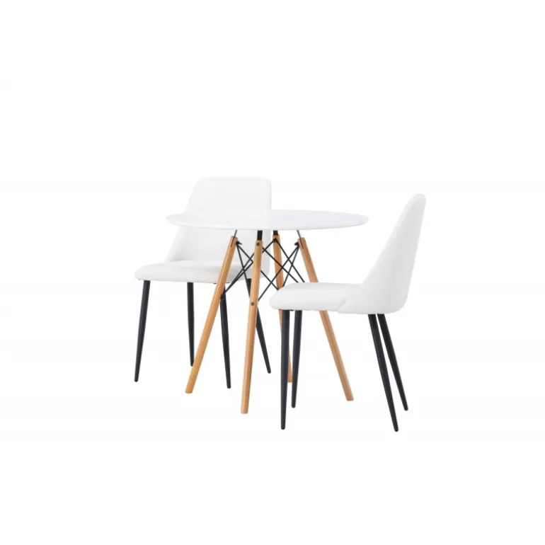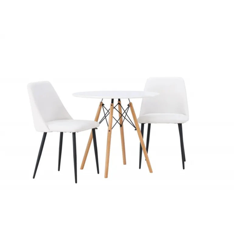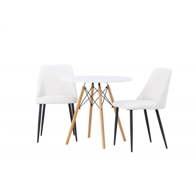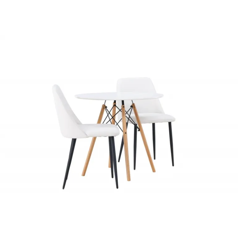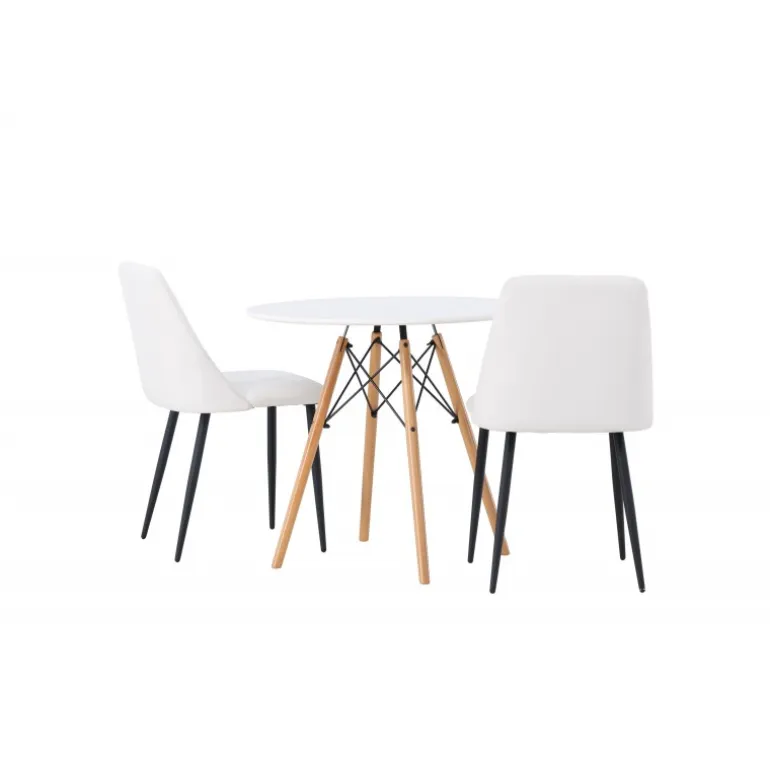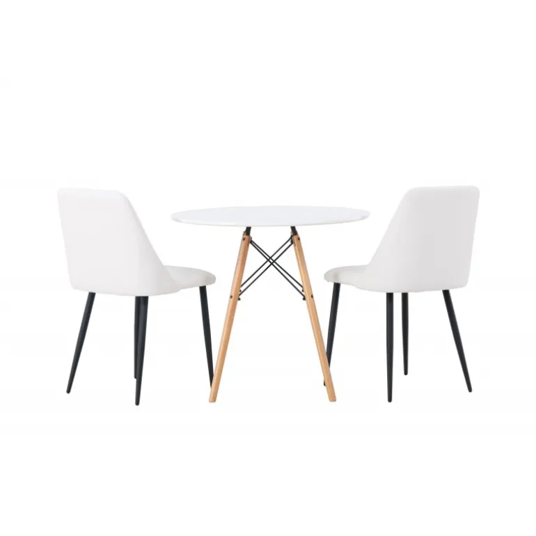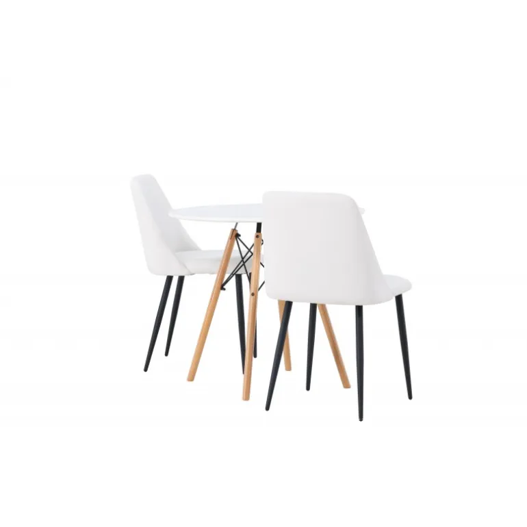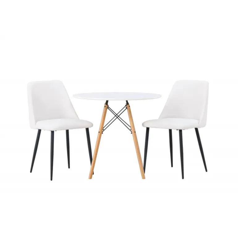 Bløde og indbydende former! Det runde spisebord Danburi har et klassisk design med en rund bordplade i hvid MDF og let skrånende ben i bøgetræ med dekorative detaljer i sort stål. Her i en stilfuld kombination med hvide spisebordsstole fra serien Night. Stolen har en fuldt polstret sæde i hvid PU-betræk, som føles lige så luksuriøs som elegant, og benene er i sort stål. Sædet er også polstret for ekstra komfort. Denne Spisebordssæt udstråler luksus og bekvemmelighed! Bordets diameter: 60 cm.