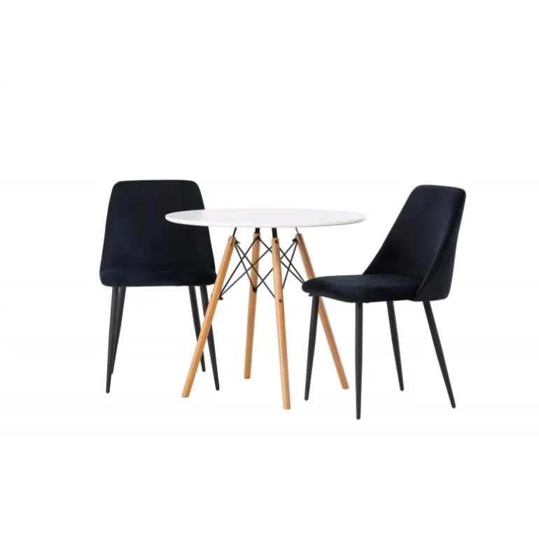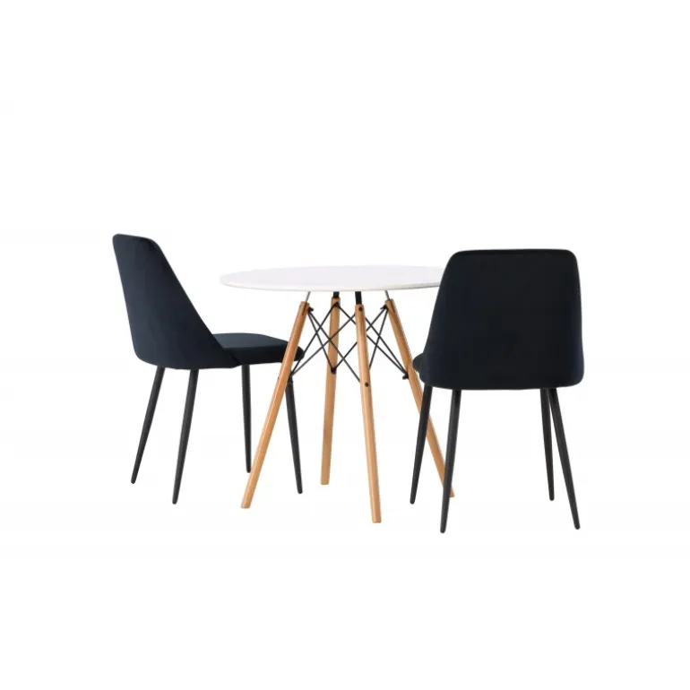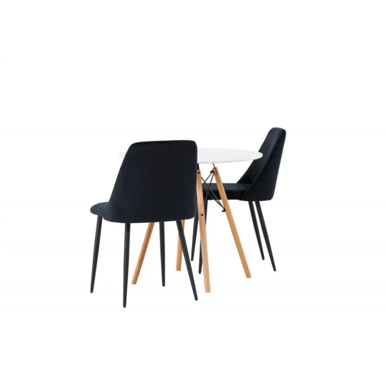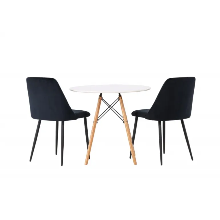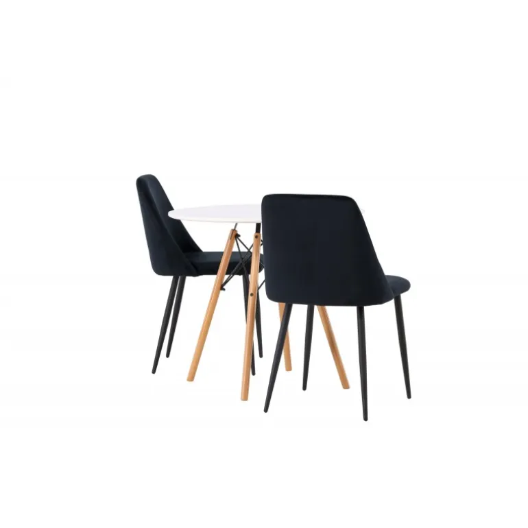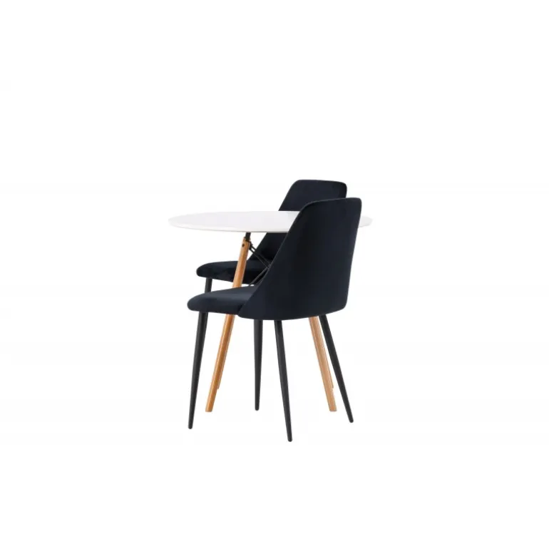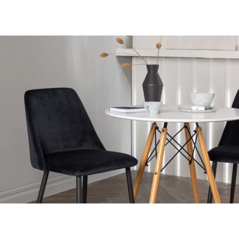 Fløjlsblødt og tæt på naturen! Det runde spisebord Danburi har et klassisk design med en rund bordplade i hvid MDF og let udadgående ben i bøgetræ med dekorative detaljer i sort stål. Her i perfekt kombination med sorte spisestole fra serien Night. Stolen har et fuldt polstret sæde i sort fløjlsstof og ben i matchende sort farve. Her får du en Spisebordssæt, der skaber en luksuriøs glans i rummet og bidrager til en indbydende og modebevidst atmosfære! Bordet har en diameter på 60 cm.