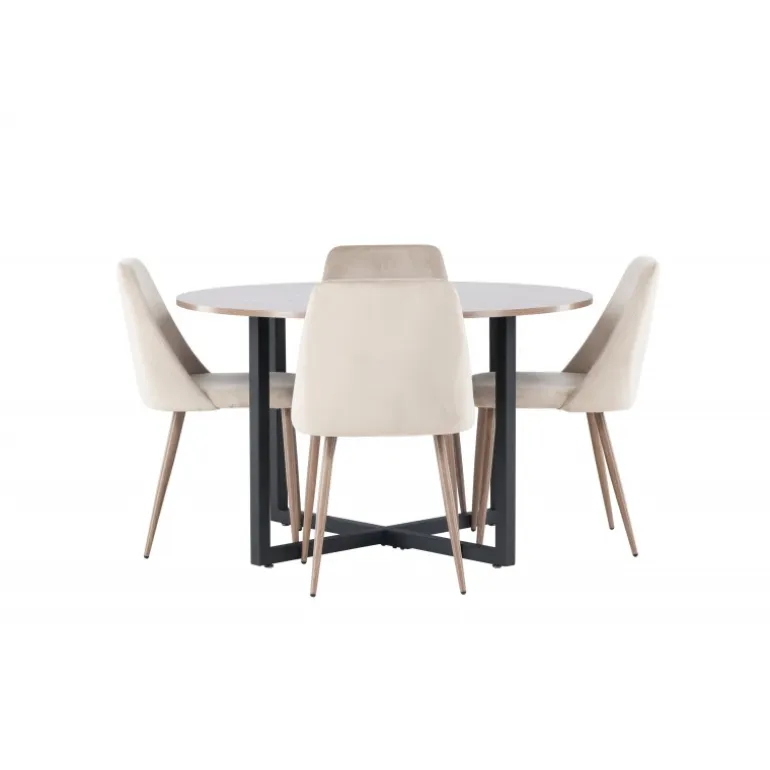 Tag plads, gør dig komfortabel, og nyd dejlige måltider med dette moderne Spisebordssæt, der udstråler luksus og komfort! Et tidløst og indbydende design gør dette Spisebordssæt til en perfekt tilføjelse til dit hjem. Vores runde spisebord Durango udstråler en klassisk stil, der modstår tidens tand. Den valnøddefarvede MDF-bordplade giver en varm og naturlig følelse, og de lige bordben, lavet af sort stål, krydser hinanden på gulvet, hvilket skaber en stabil og stilfuld base. Bordets dimensioner: 120 cm. Her i perfekt kombination med vores stilfulde stole fra Night-serien. Stolen er både komfortabel og imponerende med sit elegante design. Med en fuldt polstret sæde i brun fløjlstof tilbyder den en luksuriøs følelse og et blødt sted at sidde under lange måltider. De valnøddefarvede stålstoleben giver en flot kontrast og komplementerer bordets design harmonisk. Skab en atmosfære i hjertet af dit hjem, hvor du og dine gæster kan slappe af og nyde god mad og selskab!