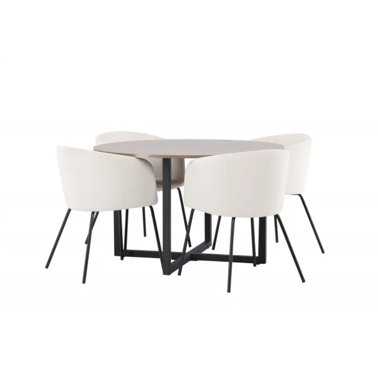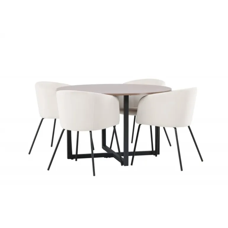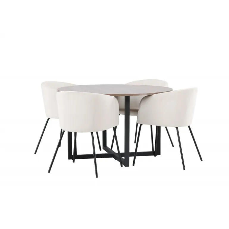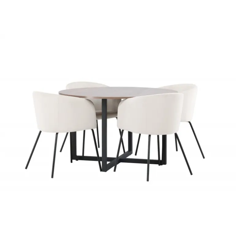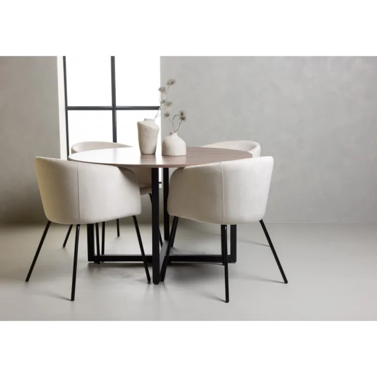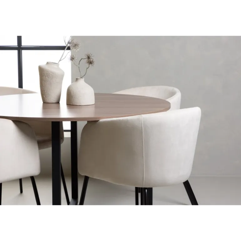 Oplev et fantastisk Spisebordssæt med bløde former! Vores runde spisebord Durango har en valnøddefarvet bordplade i MDF og lige bordben i sort stål, der samles i et kryds på gulvet. Her i en vidunderlig kombination med vores komfortable spisestole Berit. Stolen har et fuldt polstret design med en let rundet ryg og sæde i beige velourstof og smalle ben i sort jern. Det skal føles luksuriøst at sætte sig her! Bordets dimensioner: 120cm.